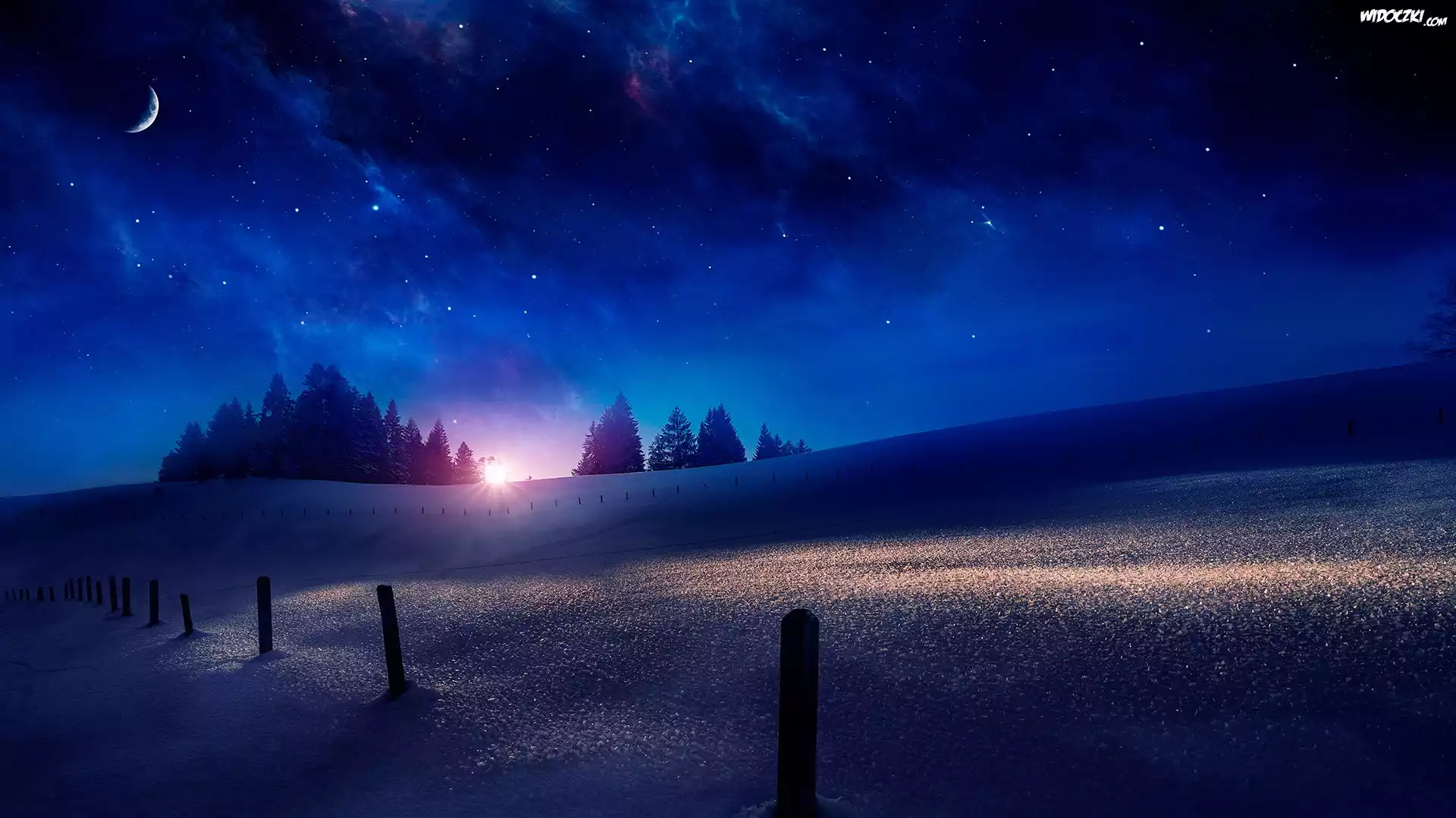 Noc, Niebo, Gwiazdy, Wzgórza, Drzewa, Zima