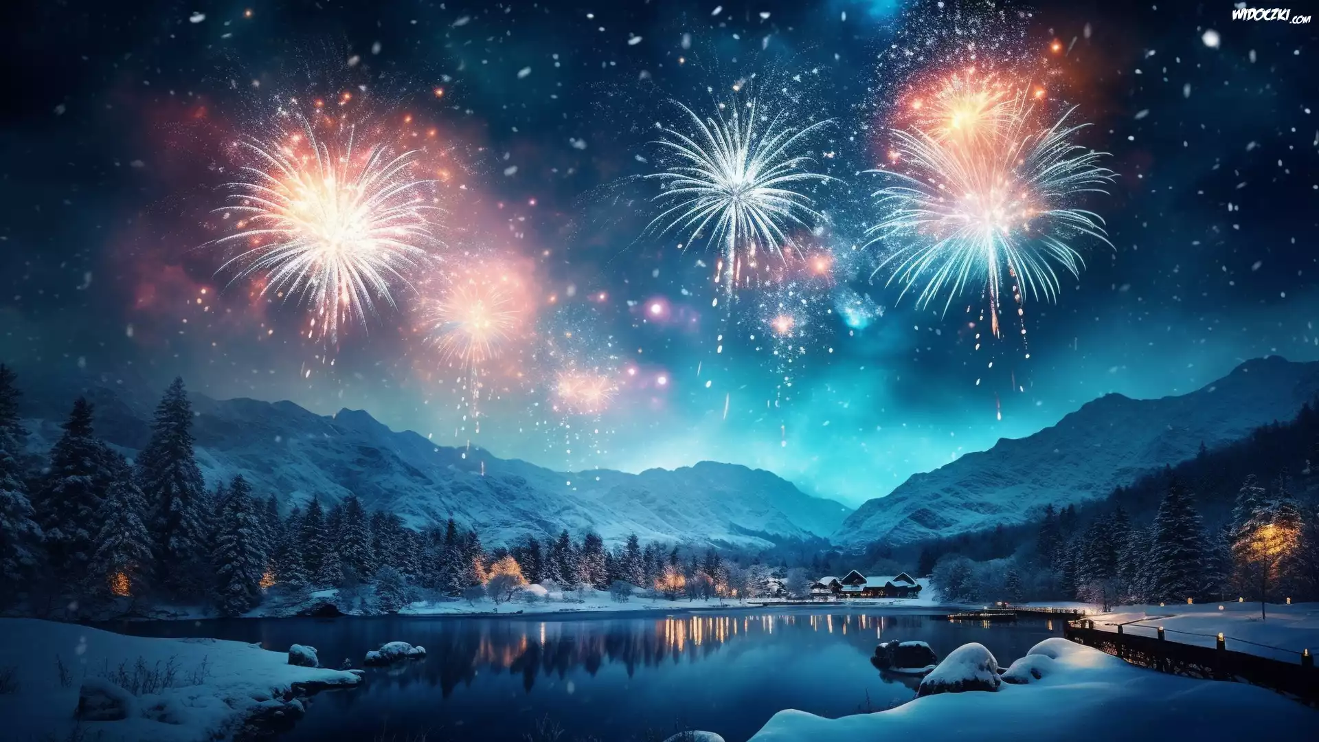 Zima, Śnieg, Fajerwerki, Jezioro, Domy, Góry, Las, Noc