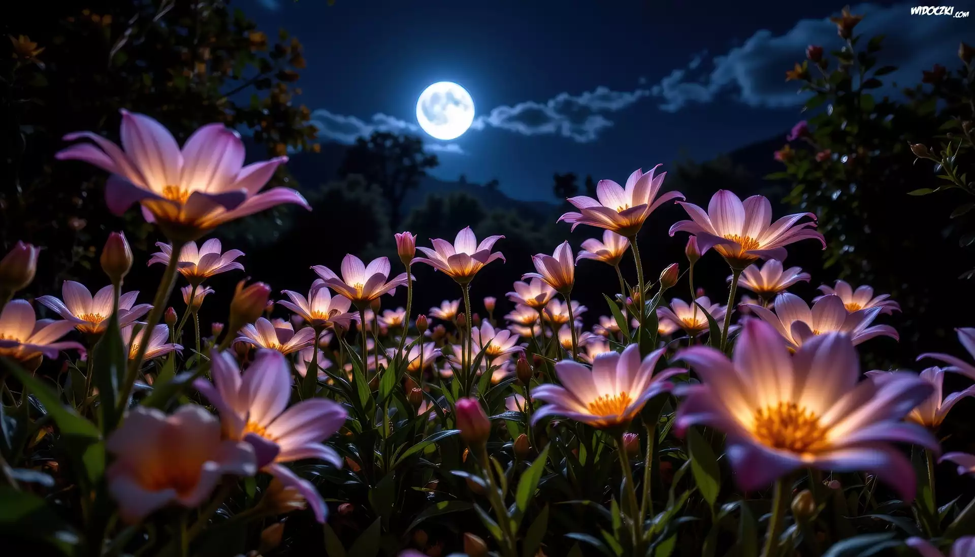 Podświetlone, Kwiaty, Ogród, Noc, Księżyc, Grafika