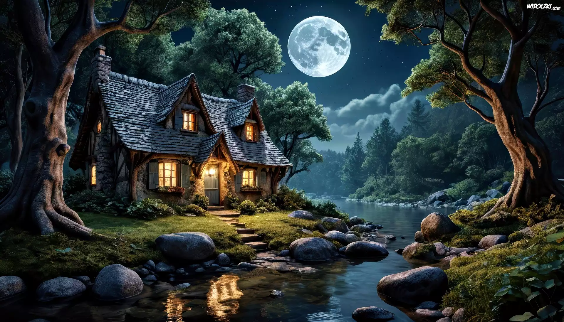 Zdjęcia, Rzeka, Drzewa, Dom, Noc, Grafika, Księżyc