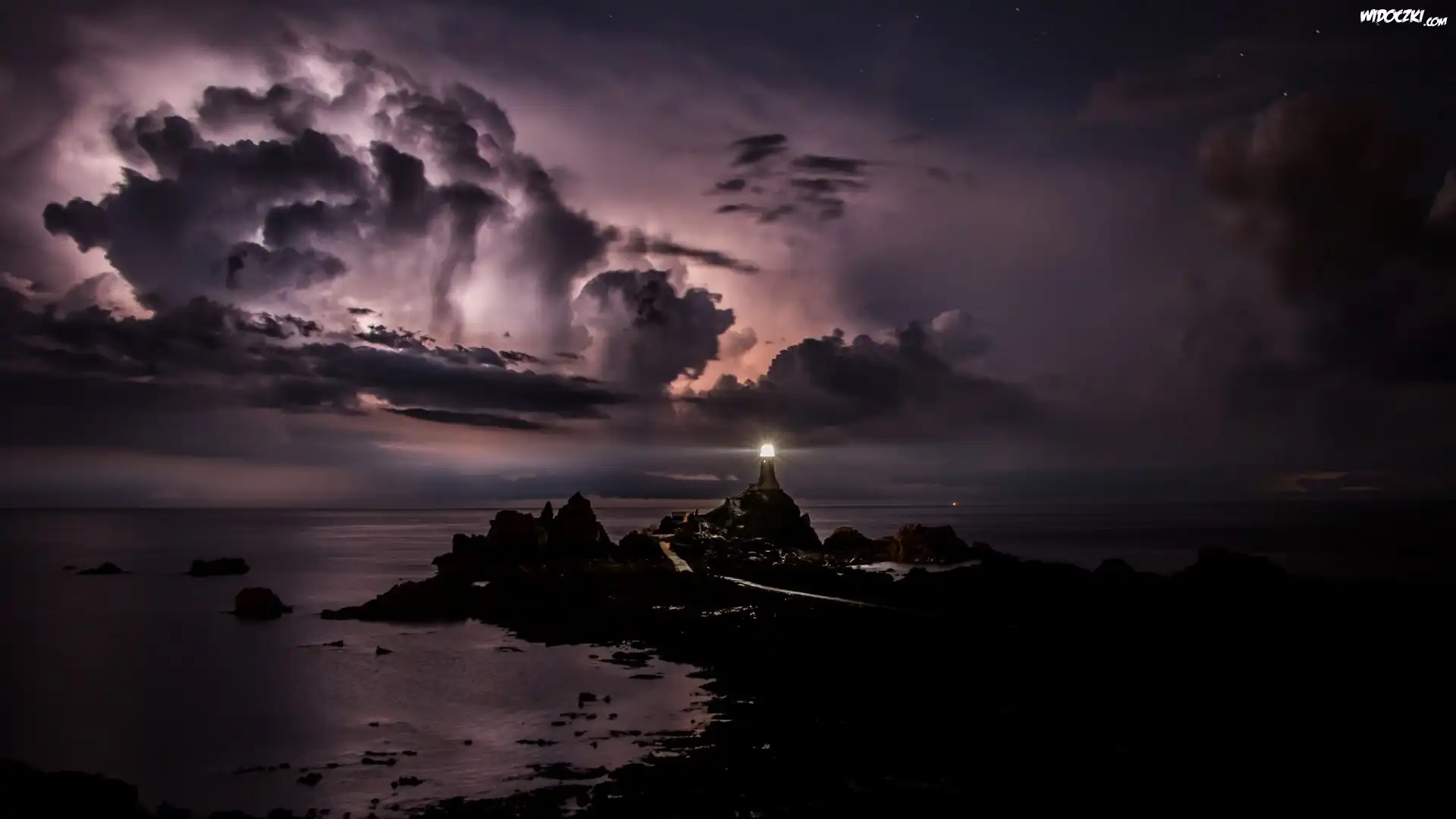 Zdjęcia, Noc, Chmury, Morze, Latarnia Morska, Skały