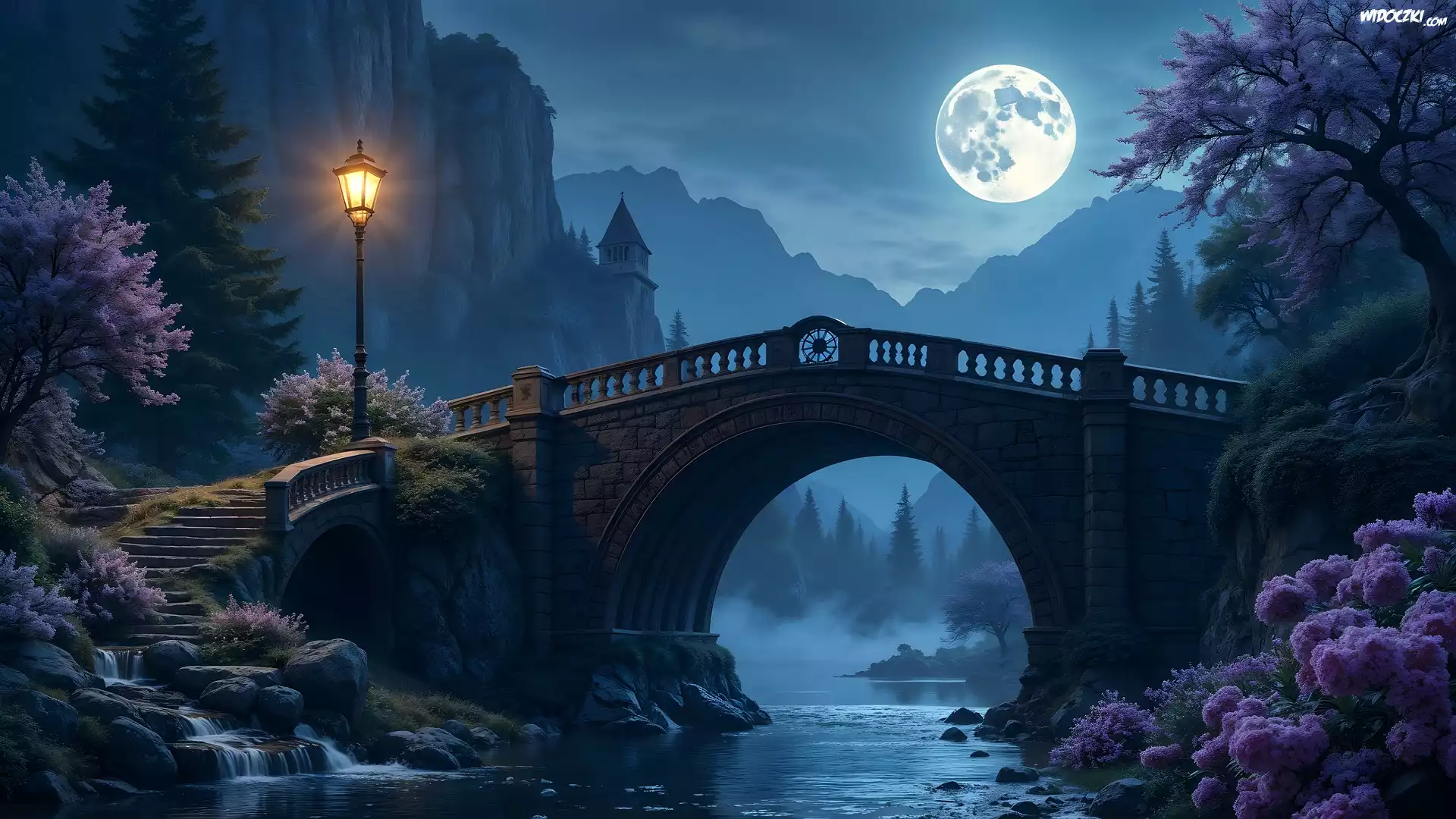 Góry, Rzeka, Most, Noc, Księżyc, Drzewa, Latarnia