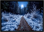 Noc, Zima, Las, Śnieg, Drzewa, Droga, Księżyc, Oszronione, Rośliny, AI