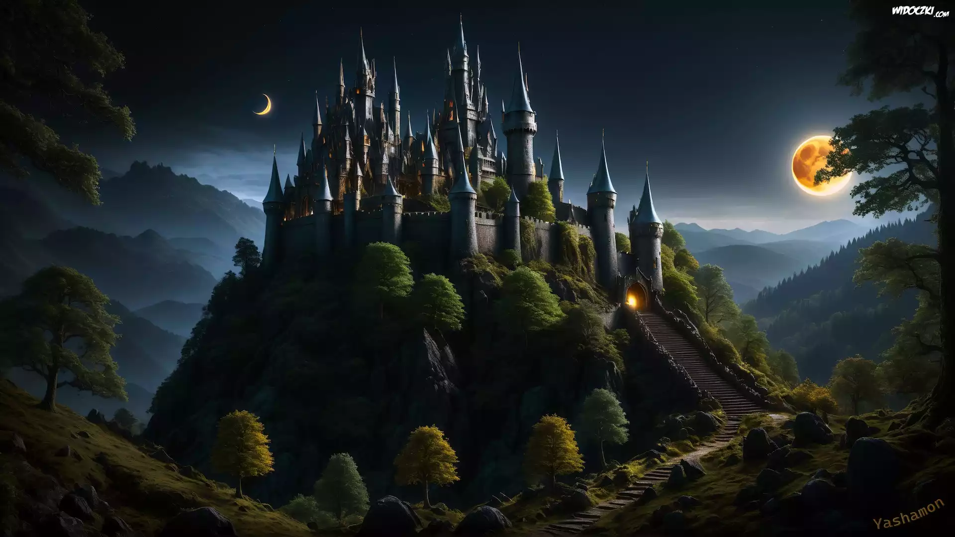 Grafika, Zamek, Wieże, Noc, Księżyc, Wzgórze, Drzewa