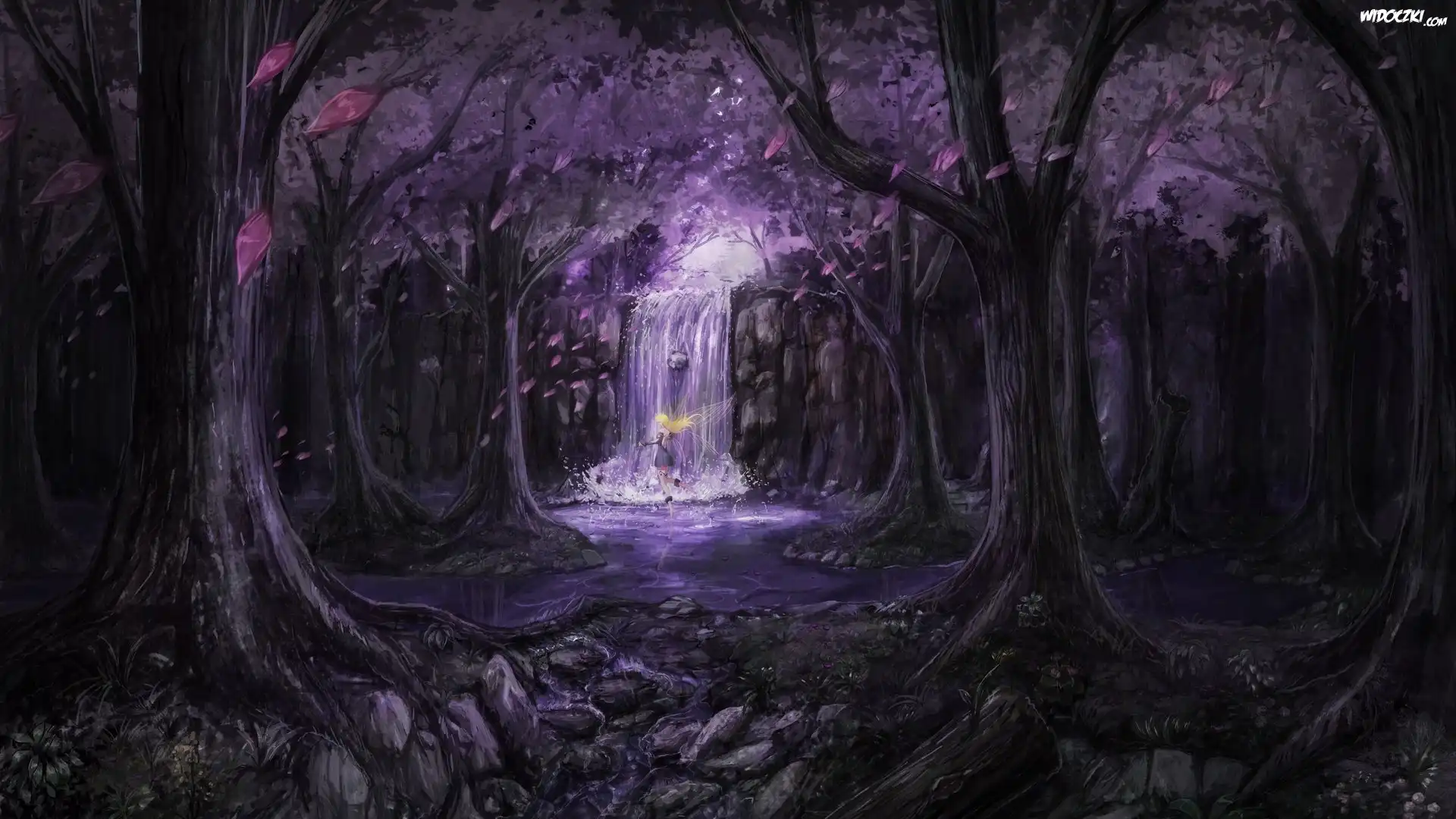 Zdjęcia, Grafika, Rzeka, Wodospad, Blask, Światła, Dziewczyna, Las, Drzewa, Noc