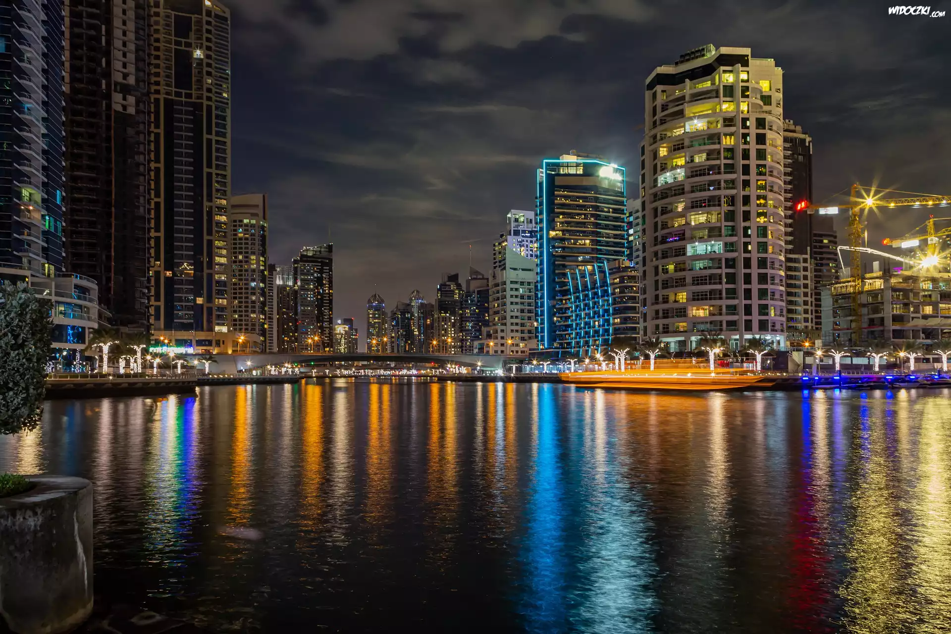 Miasto nocą, Wieżowce, Rzeka, Dubaj, Zjednoczone Emiraty Arabskie