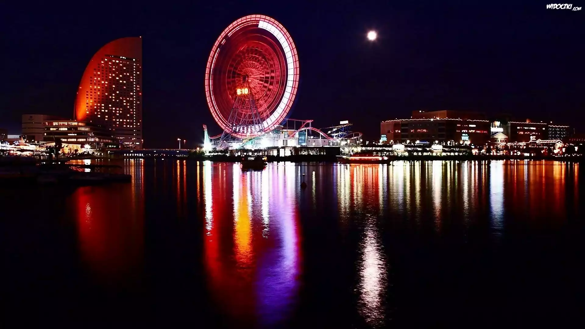 Zdjęcia, Jokohama, Nocą, Morze, Księżyc, Barwne, Światła, Odbicie
