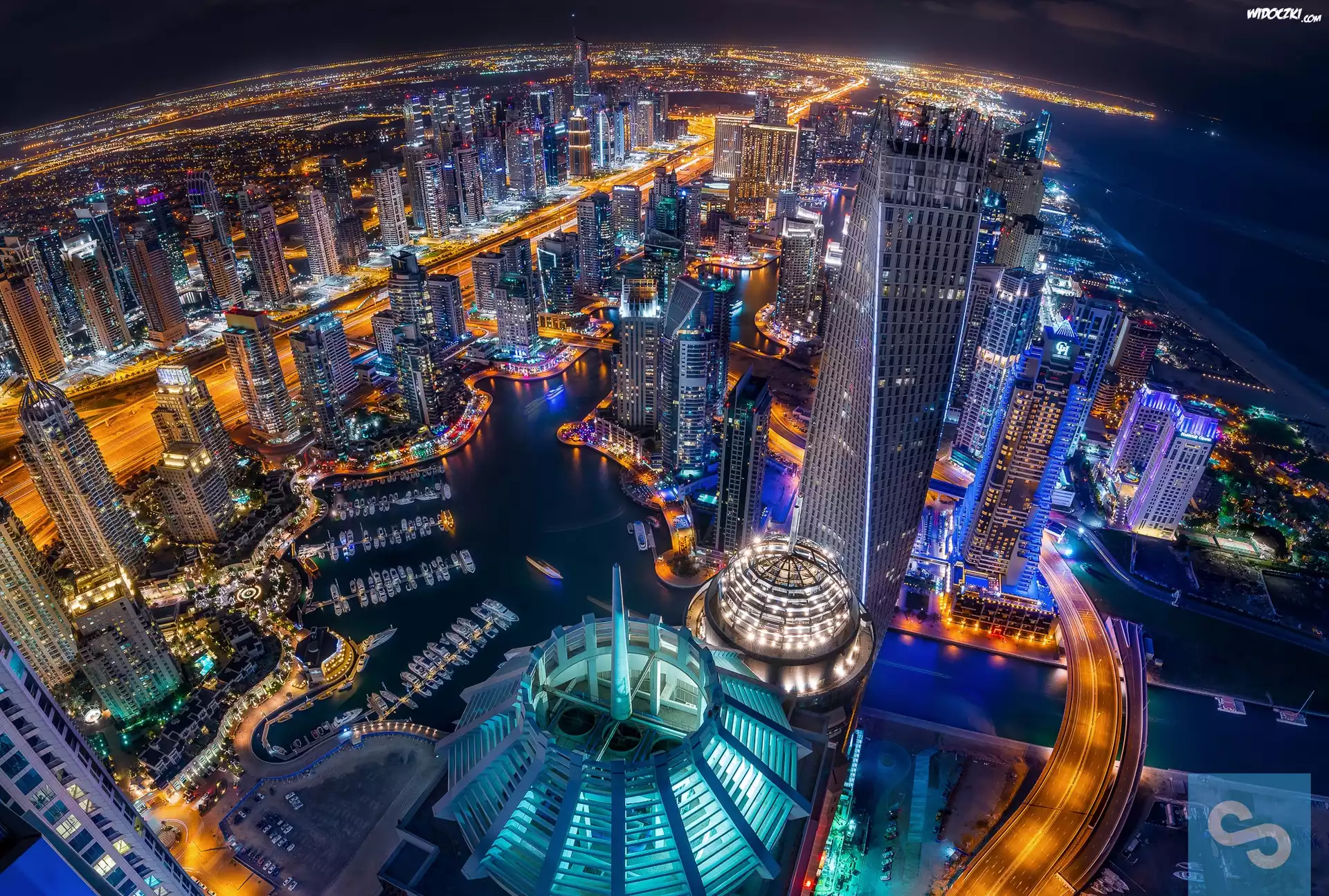 Zdjęcia, Miasto nocą, Dubaj, Widnokrąg, Z lotu ptaka