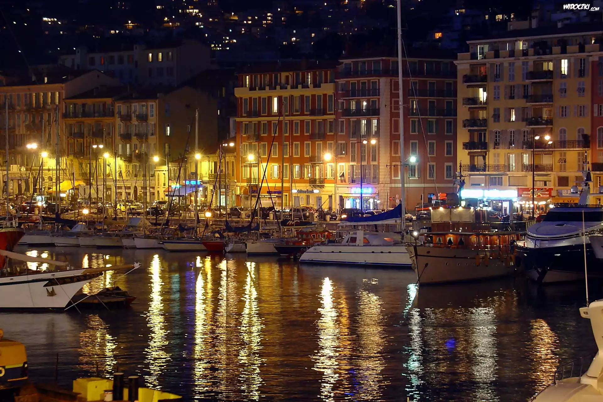 Zdjęcia, Nicea, Nocą, Morze, Wybrzeże, Port, Łodzie, Jachty