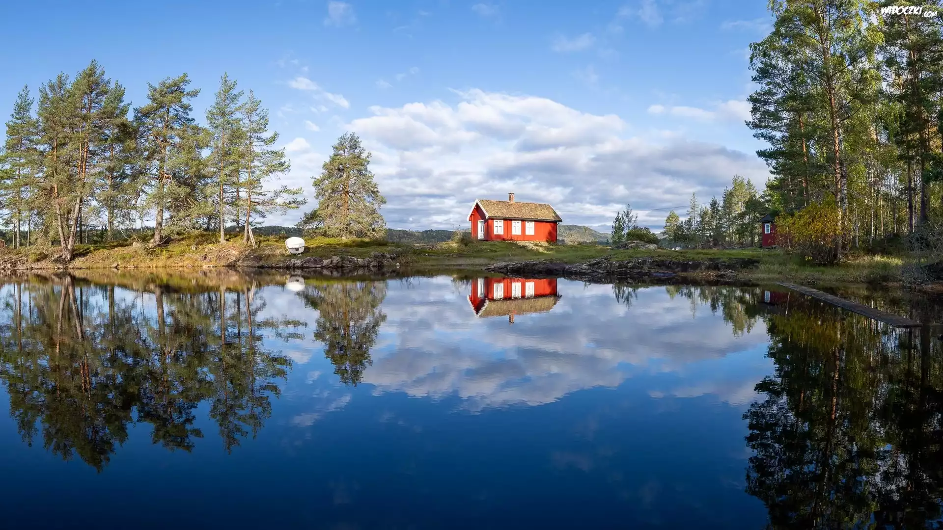 Norwegia, Ringerike, Jezioro Vaeleren, Drzewa, Łódka, Dom, Chmury, Odbicie
