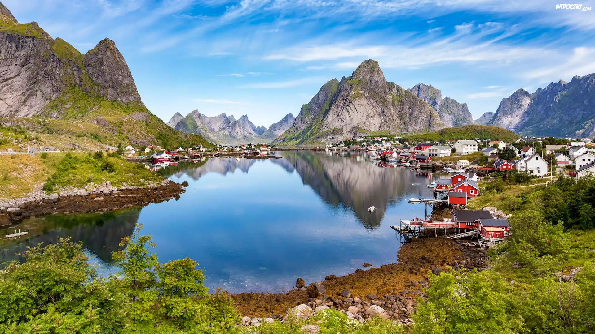 Zdjęcia, Norwegia, Lofoty, Wyspa Moskenesoya, Wioska Reine, Morze Norweskie, Domy, Góry
