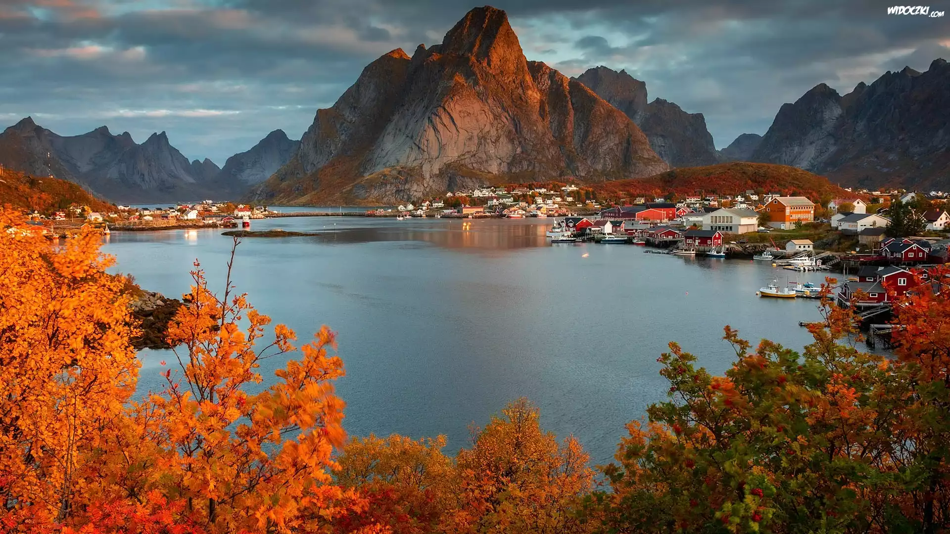 Zdjęcia, Norwegia, Lofoty, Hamnoy, Jesień, Morze, Góry, Skały, Domy, Drzewa, Rośliny