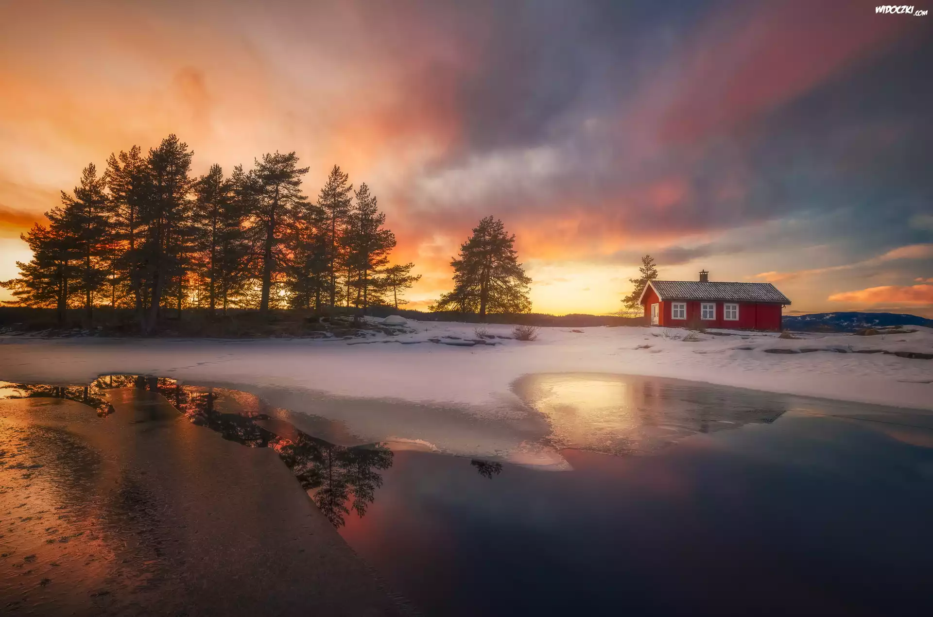 Ringerike, Norwegia, Zima, Jezioro, Domek, Zachód Słońca, Drzewa
