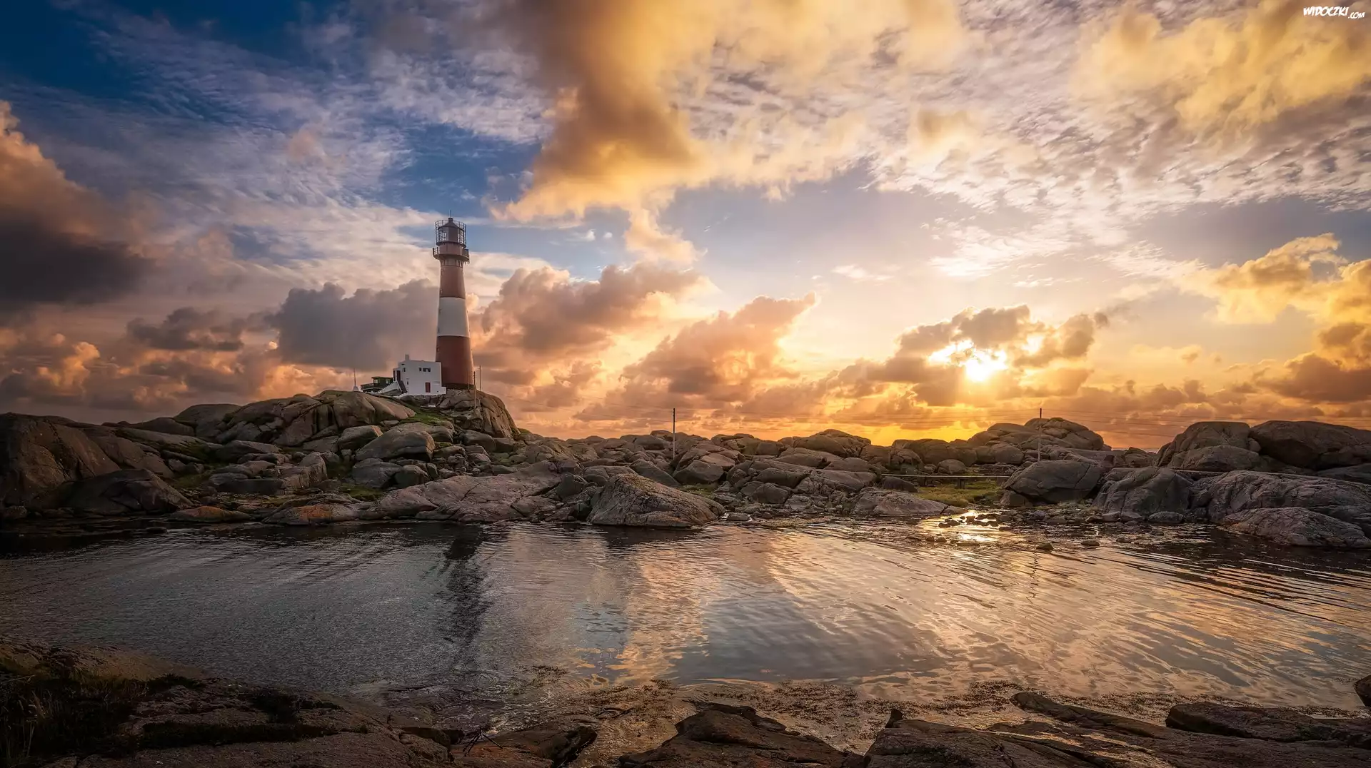Zdjęcia, Norwegia, Wyspa Midbrødøya, Latarnia morska Eigerøy Lighthouse, Skały, Chmury, Wschód słońca
