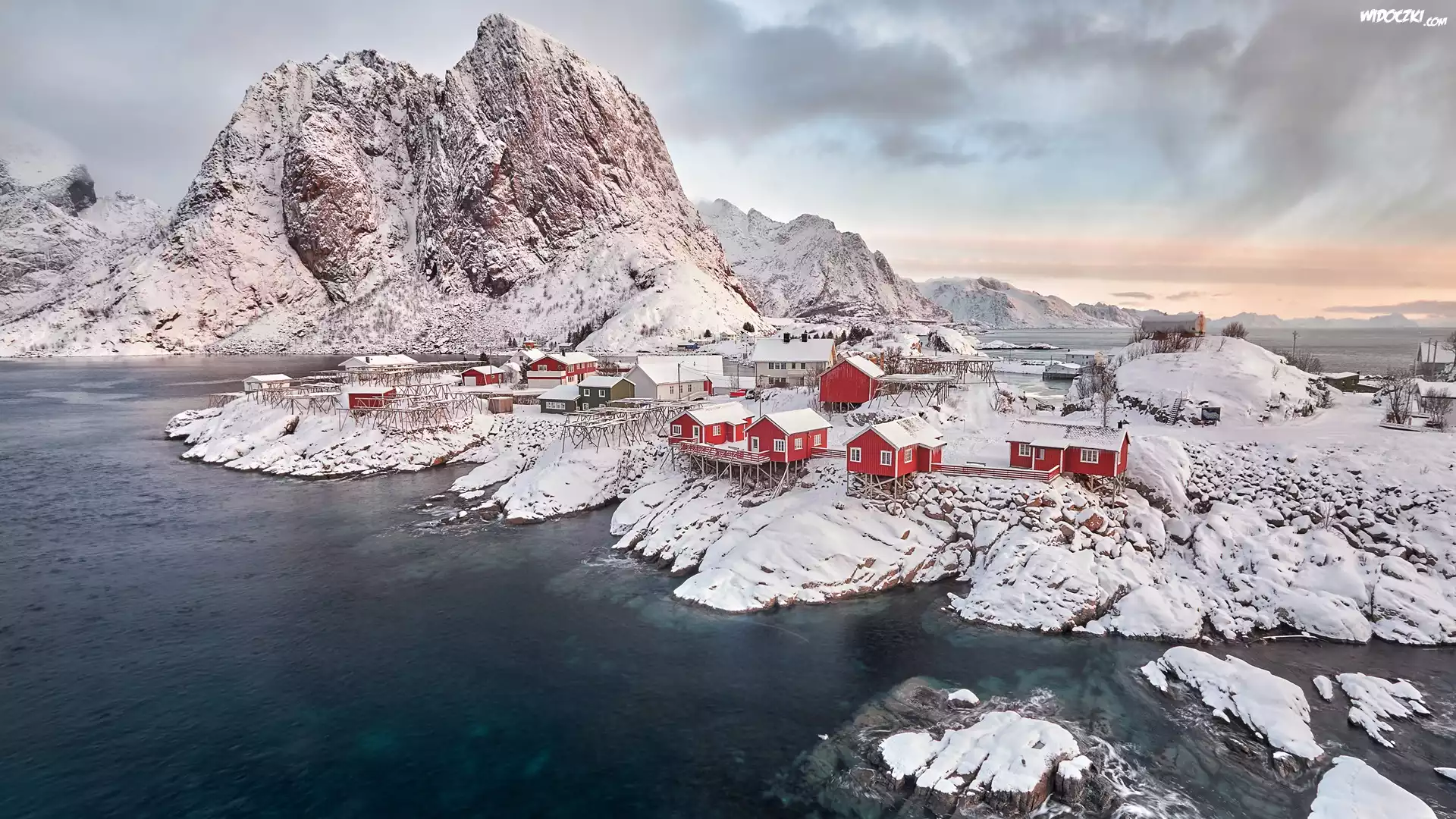 Zdjęcia, Norwegia, Lofoty, Chmury, Domy, Góry, Zima