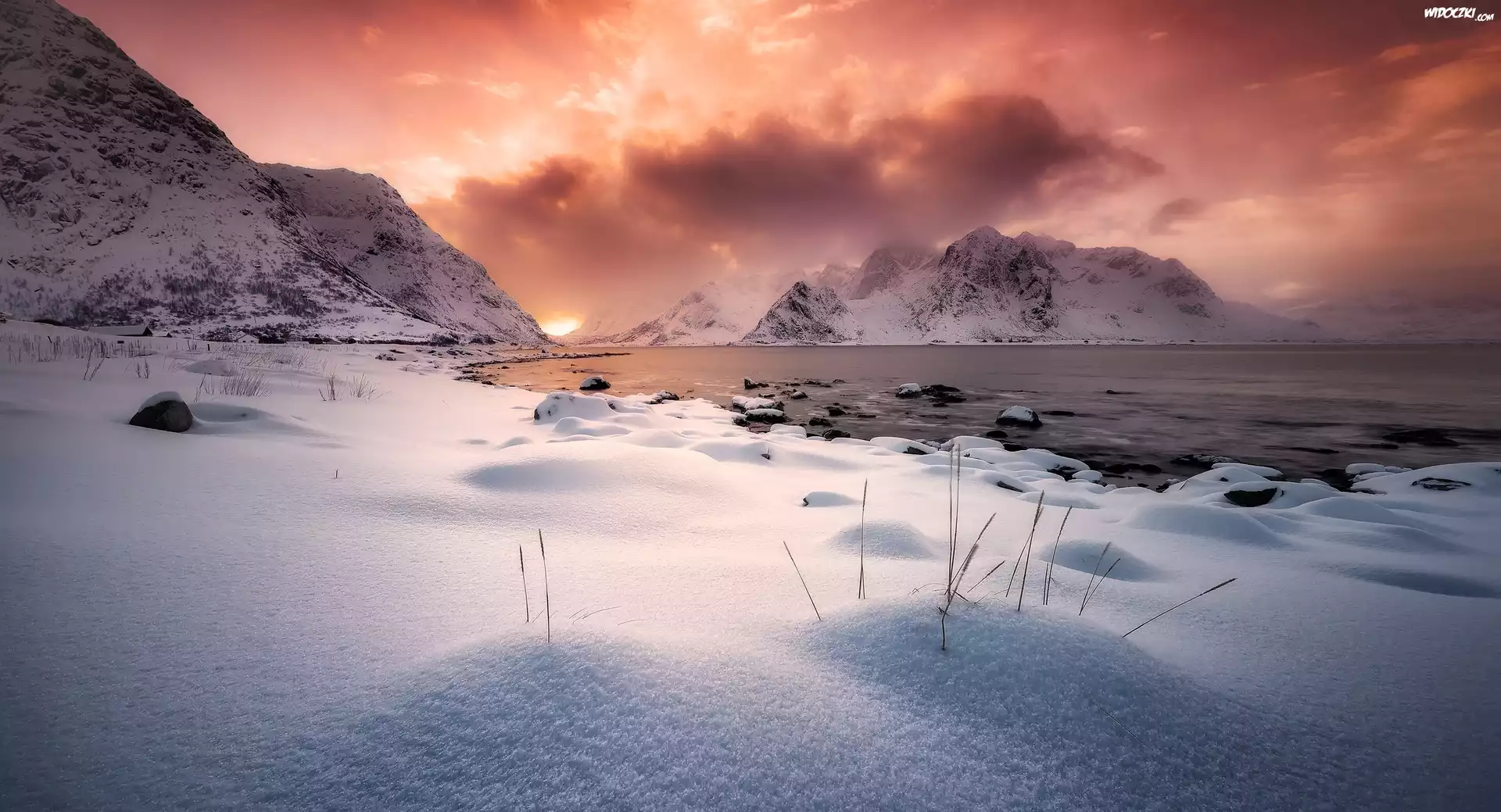 Norwegia, Lofoty, Vareid, Zima, Góry, Morze