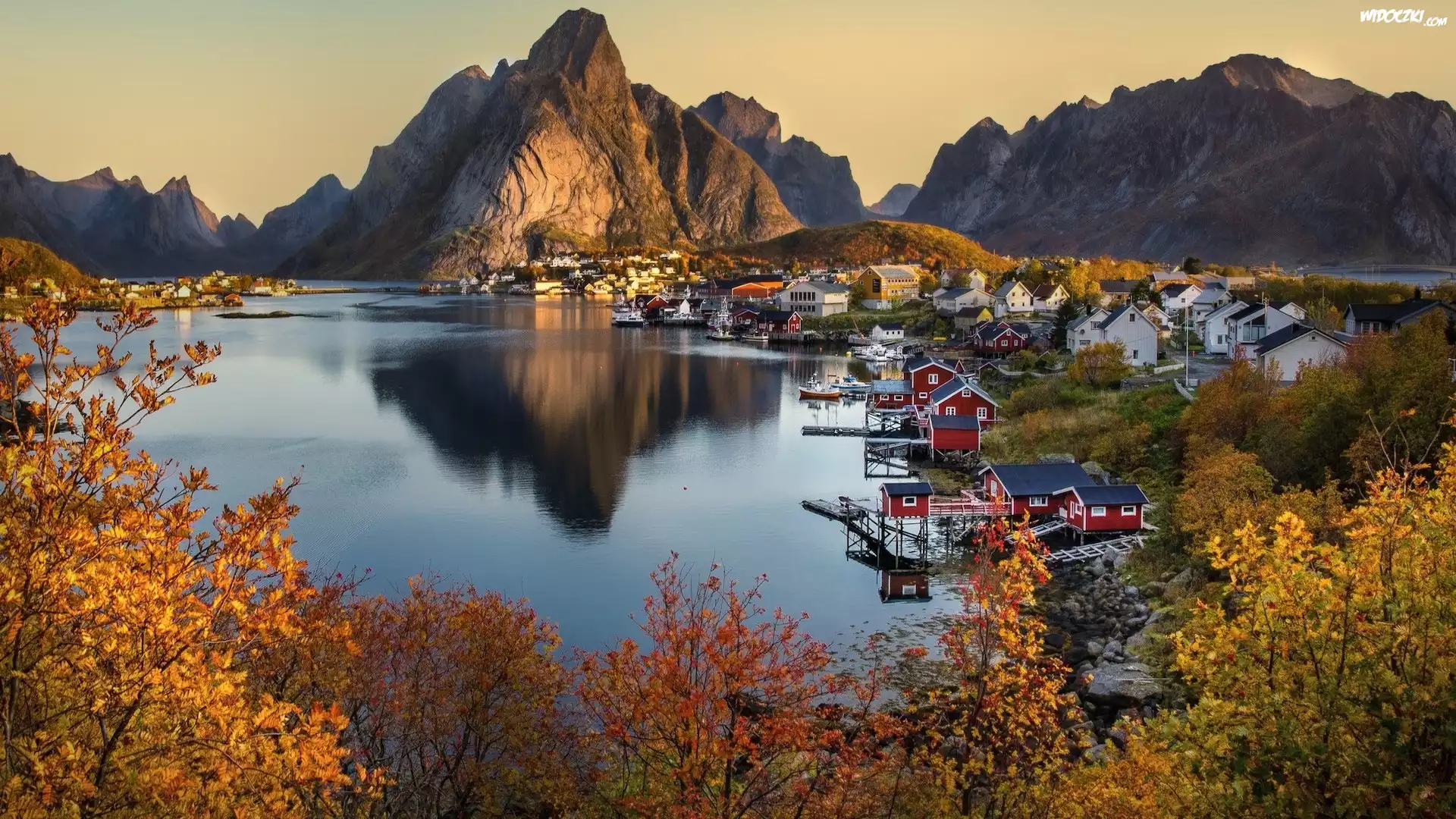 Zdjęcia, Norwegia, Lofoty, Morze, Góry, Ioska Reine, Jesień, Domy, Drzewa