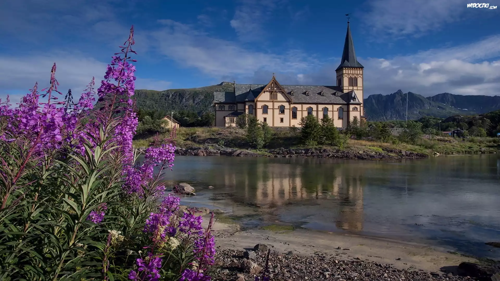 Zdjęcia, Norwegia, Rzeka, Budynek, Purpurowe, Kwiaty, Góry