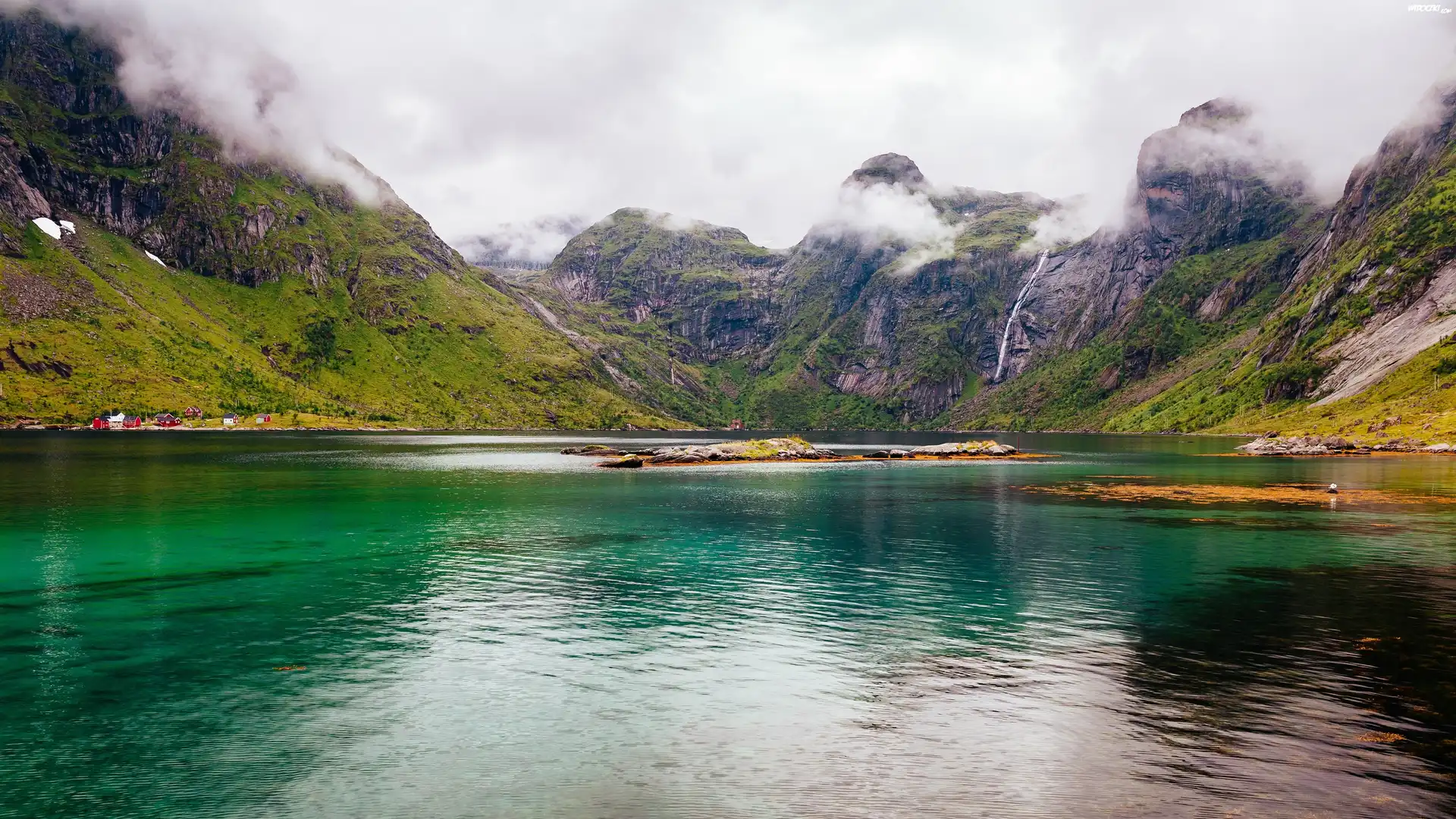 Norwegia, Lofoty, OkrÄ™g Nordland, Wyspa Moskenesøya, WieÅ› Sørvågenna, Jezioro, Góry, Wioska, MgÅ‚a |