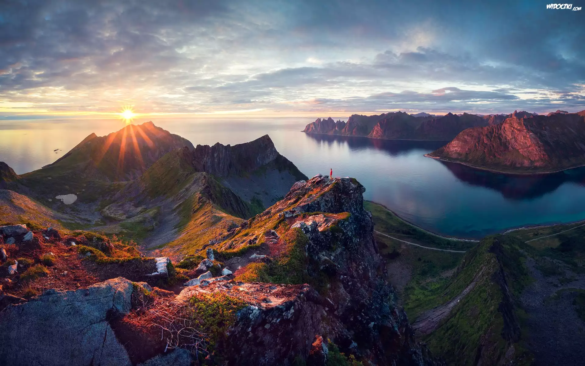 Zdjęcia, Norwegia, Wyspa Senja, Góry, Szczyt Husfjellet, Mgła, Postać, Morze