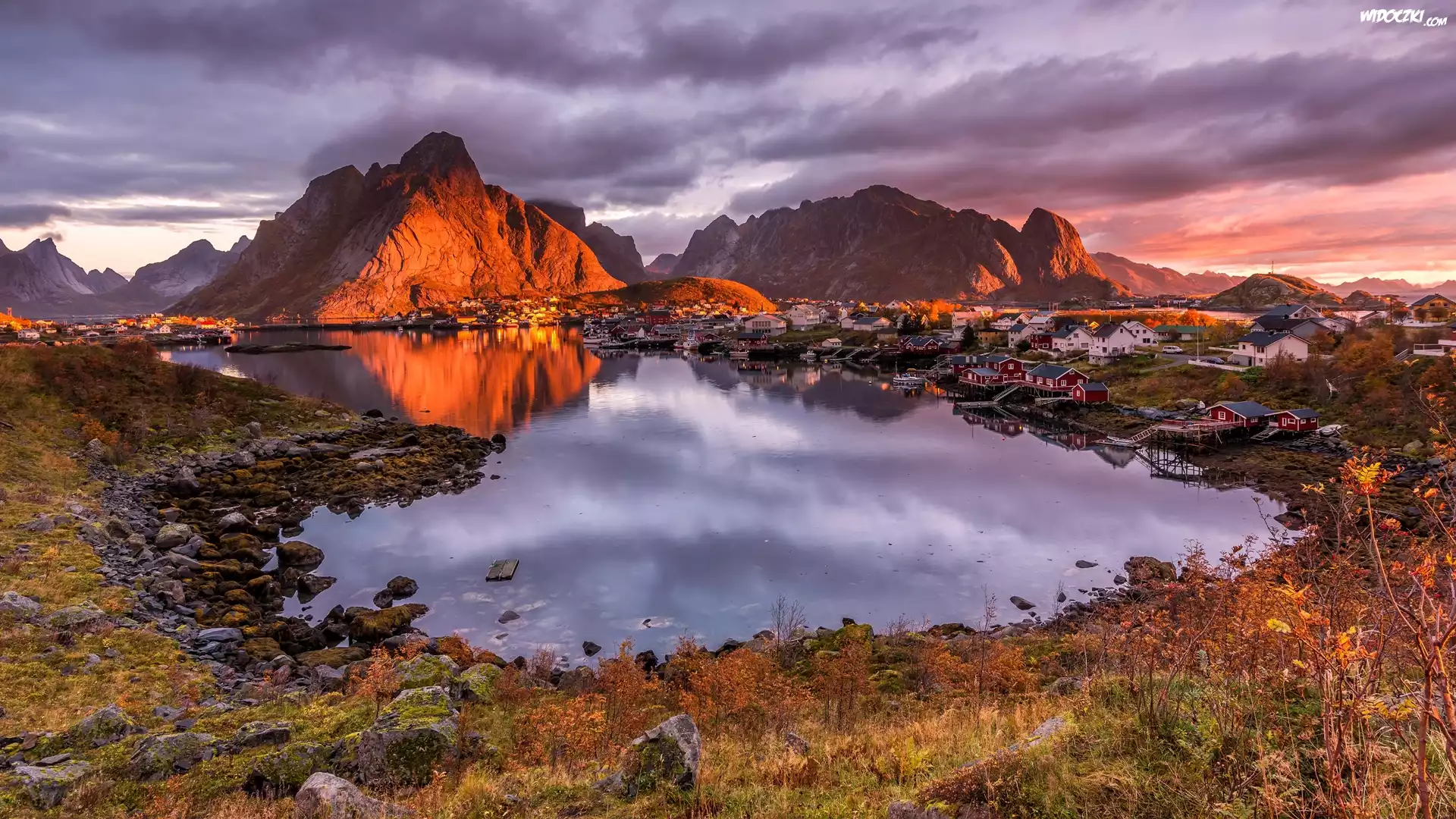 Norwegia, Lofoty, Wyspa Moskenesoya, Wioska Reine, Morze Norweskie Góry, Domy, Wschód słońca, Chmury |