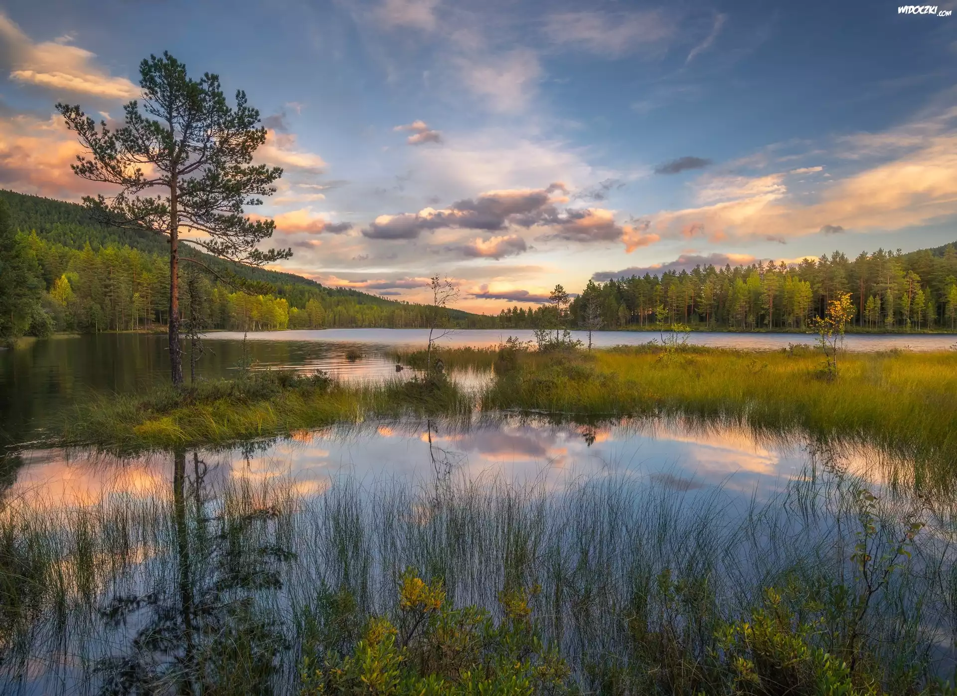 Zdjęcia, Jezioro, Drzewa, Trawy, Chmury, Odbicie, Miejscowość Sokna, Gmina Ringerike, Norwegia