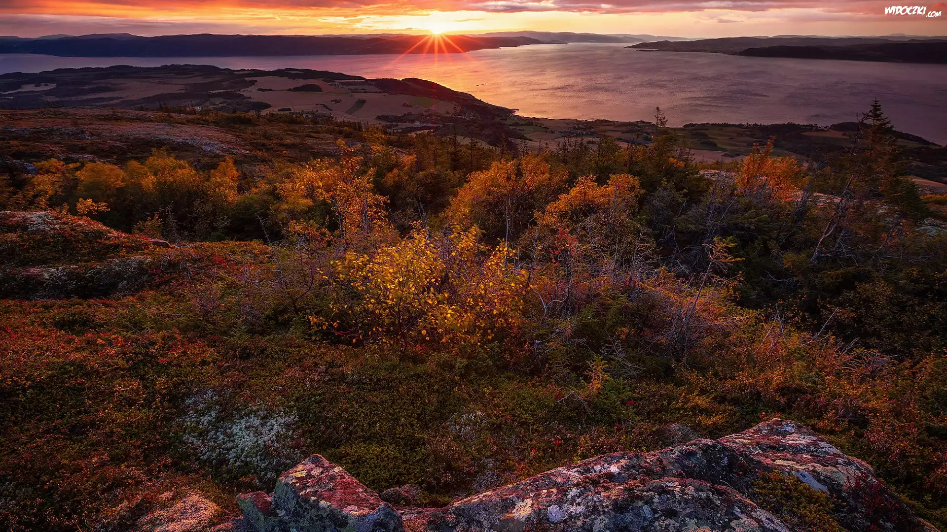 Norwegia, Trondheim, Rezerwat przyrody Bymarka, Zachód słońca, Jesień, Fiord Trondheimsfjorden, Góry, Drzewa, Kamienie |