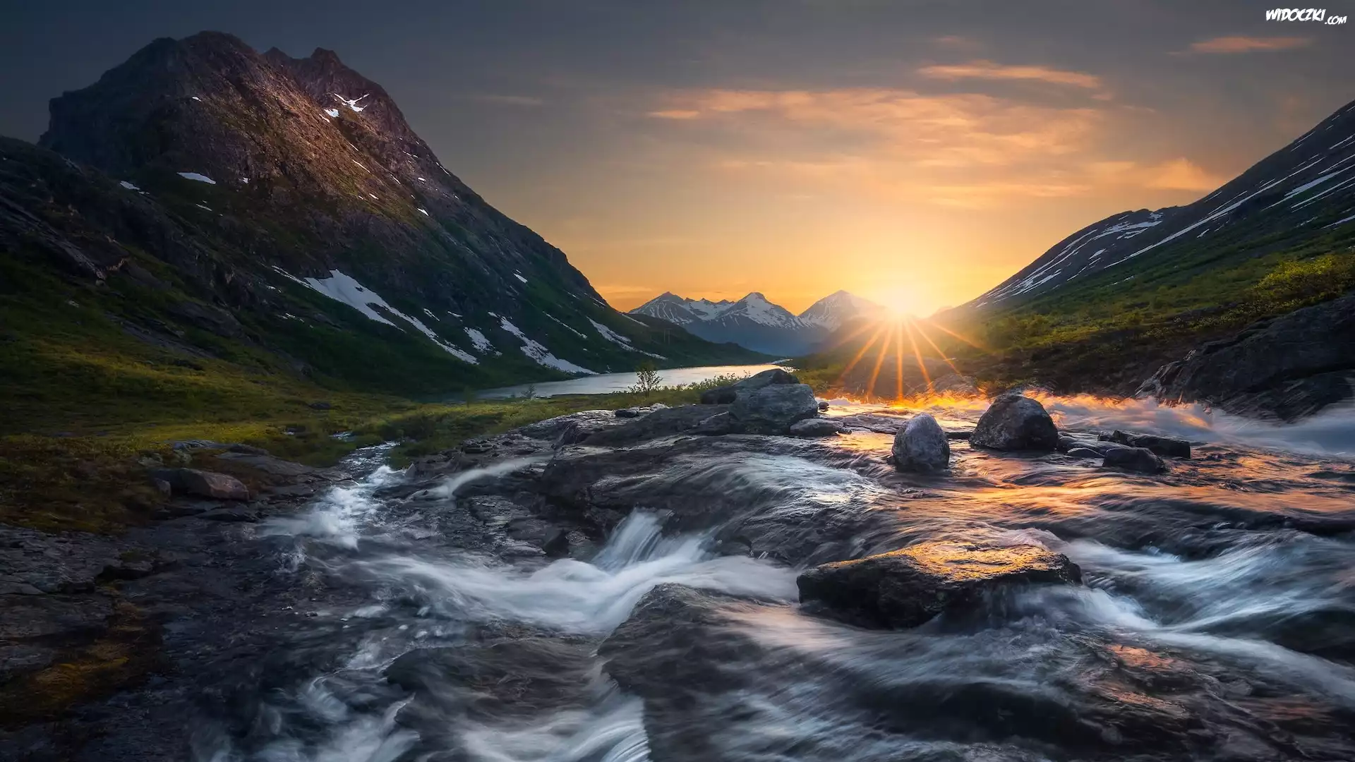 Zdjęcia, Góry, Rzeka Rauma, Jezioro, Promienie słońca, Dolina, Romsdalen, Norwegia