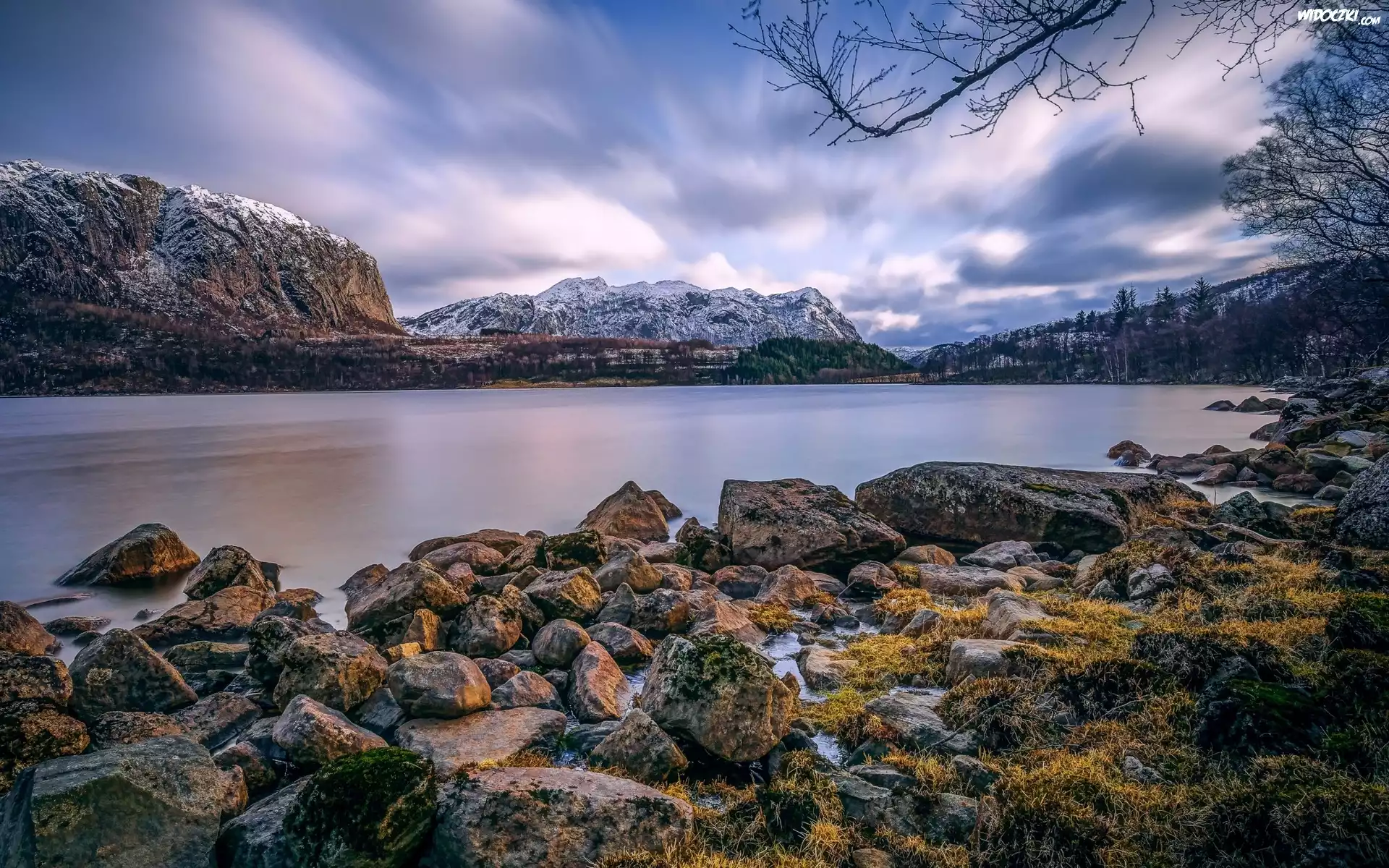Góry, Jezioro Hofreistae, Kamienie, Skały, Niebo, Miejscowość Bjerkreim, Rogaland, Norwegia