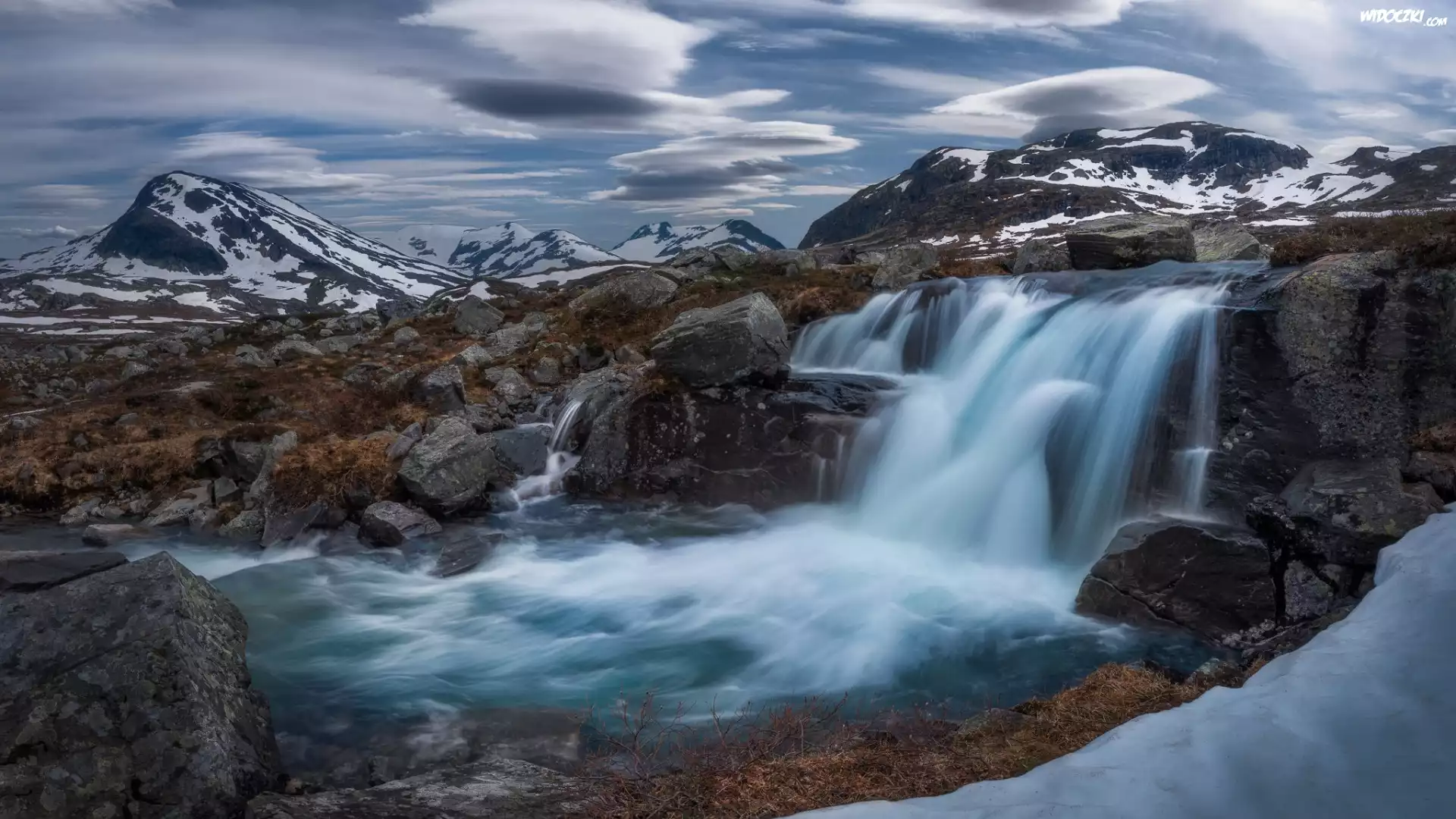 Zdjęcia, Norwegia, Góry Jotunheimen, Wodospad, Skały, Chmury