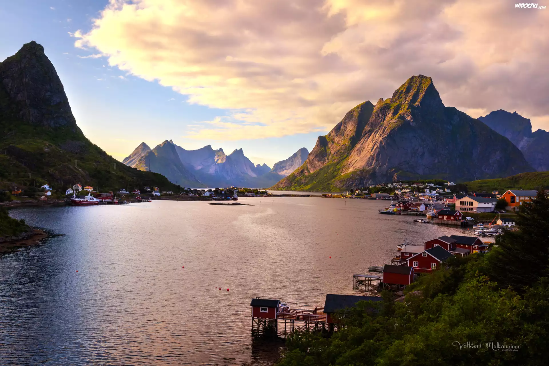 Zdjęcia, Norwegia, Lofoty, Góry, Wioska, Reine, Domy, Morze, Wschód Słońca, Roślinność