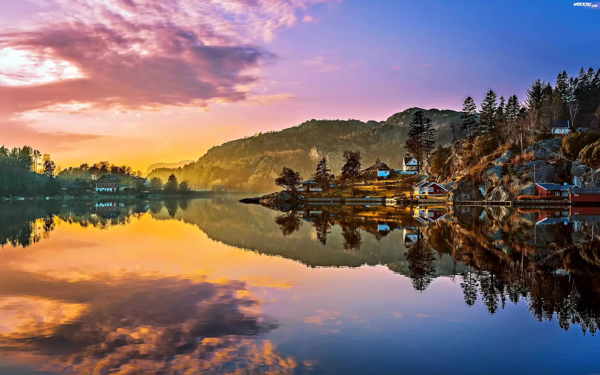 Norwegia, Jezioro, Góry, Zachód Słońca, Odbicie