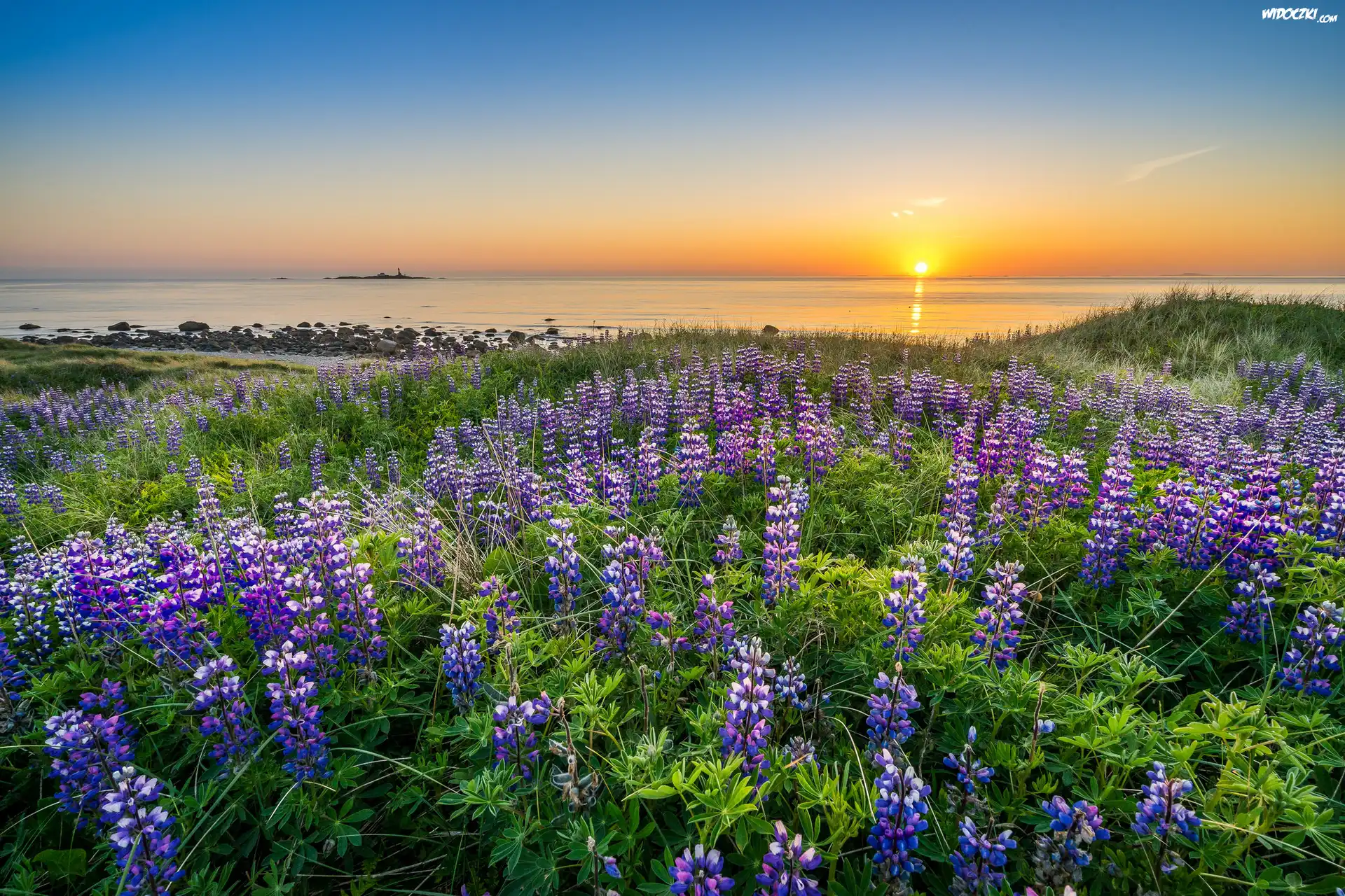 Zdjęcia, Norwegia, Rogaland, Morze, Zachód słońca, Łubin