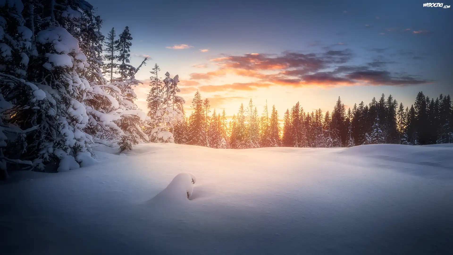 Norwegia, Region Sør-Trøndelag, Miasto Trondheim, Bymarka, Zachód SÅ‚oÅ„ca, Zima, Las, Drzewa, Chmury |