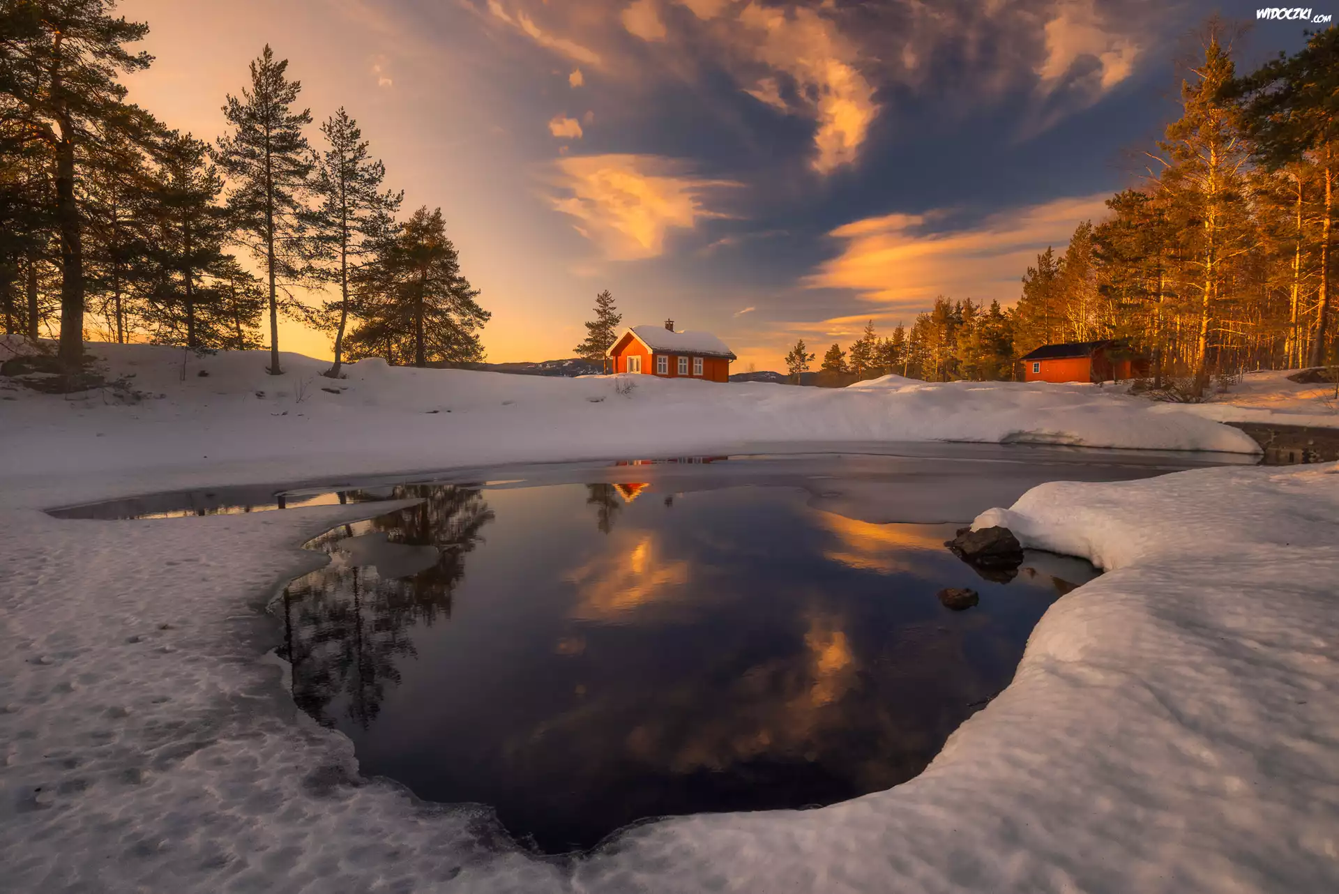 Ringerike, Jezioro Vaeleren, Domy, Drzewa, Zachód słońca, Zima, Norwegia