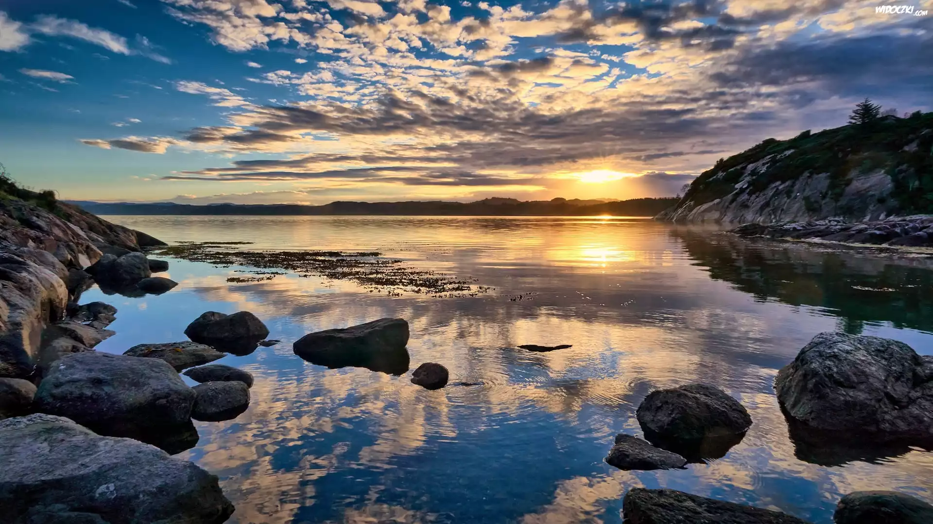 Norwegia, Morze, Kamienie, Góry, Wschód słońca
