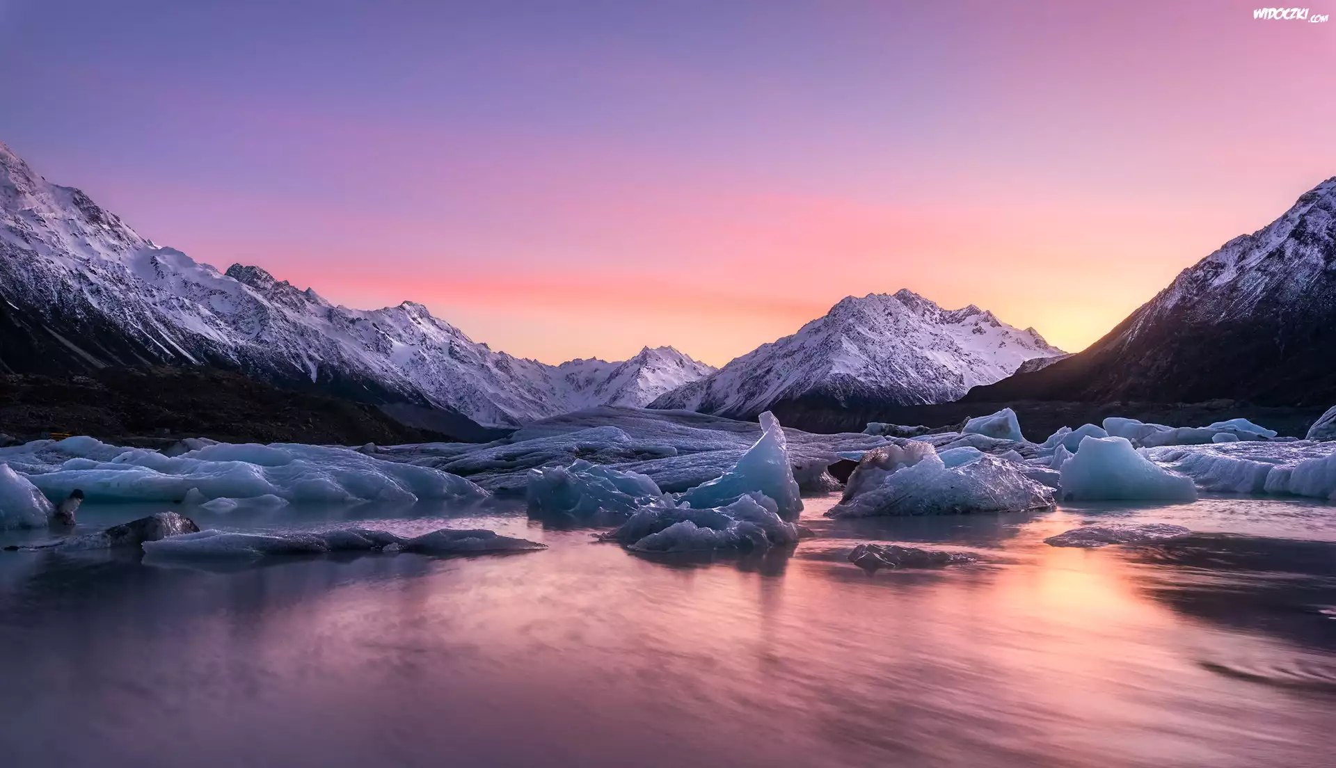 Nowa Zelandia, Jezioro Tasmana, Tasman Lake, Góry, Góra Cooka, Lód, Wschód słońca, Park Narodowy Góry Cooka |