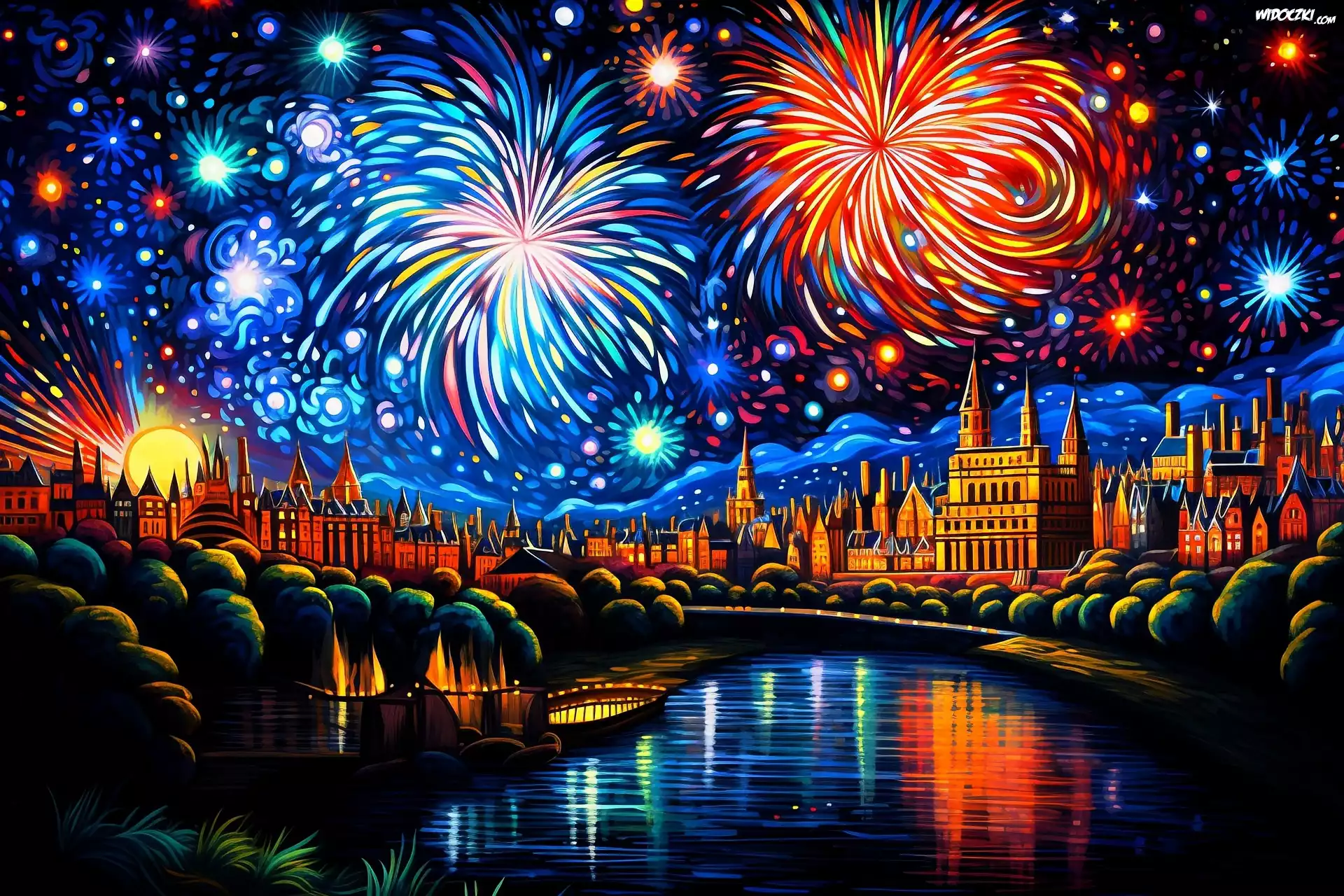 Zdjęcia, Nowy Rok, Miasto, Noc, Rzeka, Oświetlone, Domy, Kolorowe, Fajerwerki, Grafika