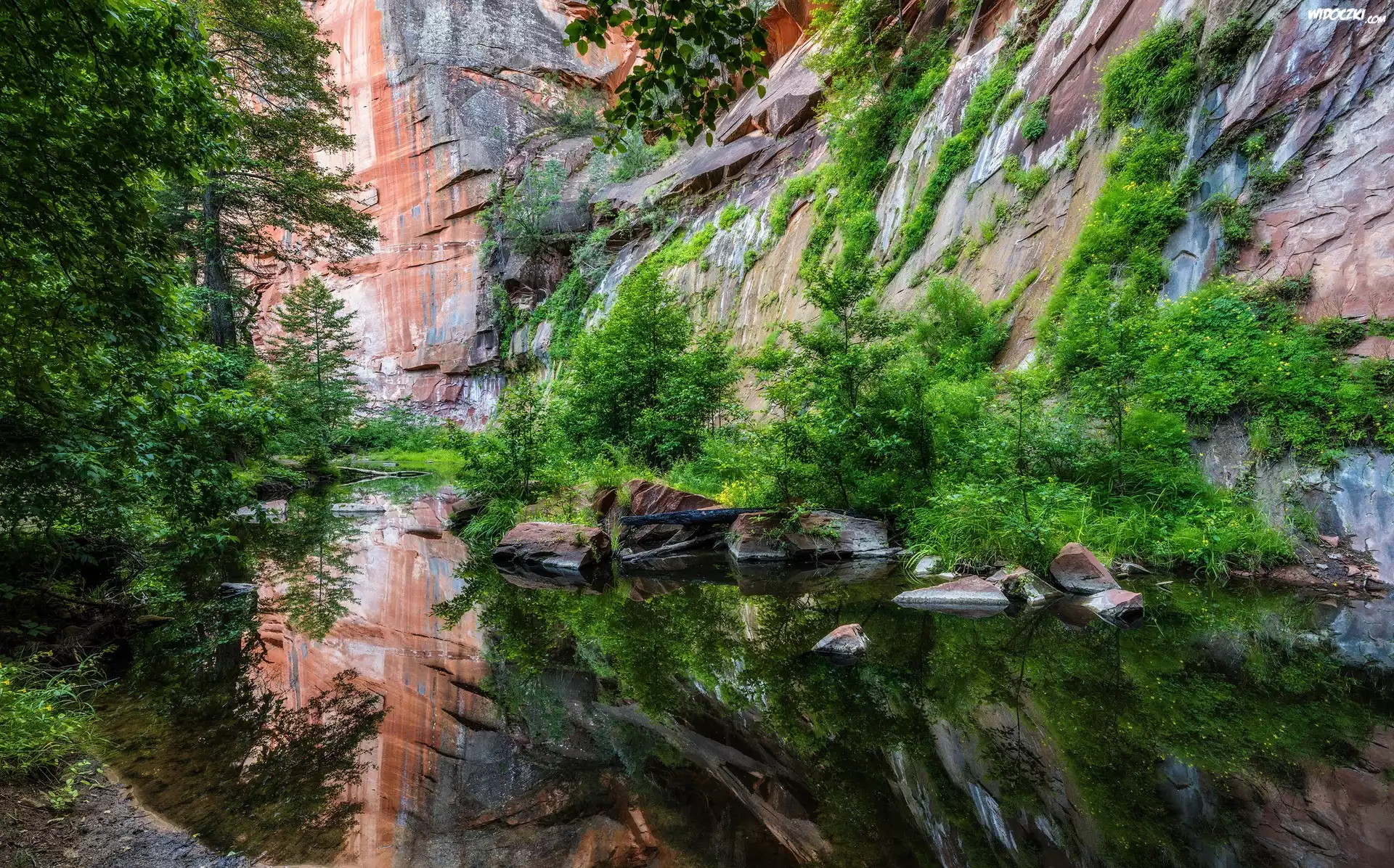 Stany Zjednoczone, Arizona, Sedona, Skały, Wąwóz, Oak Creek, Rzeka, Drzewa, Roślinność