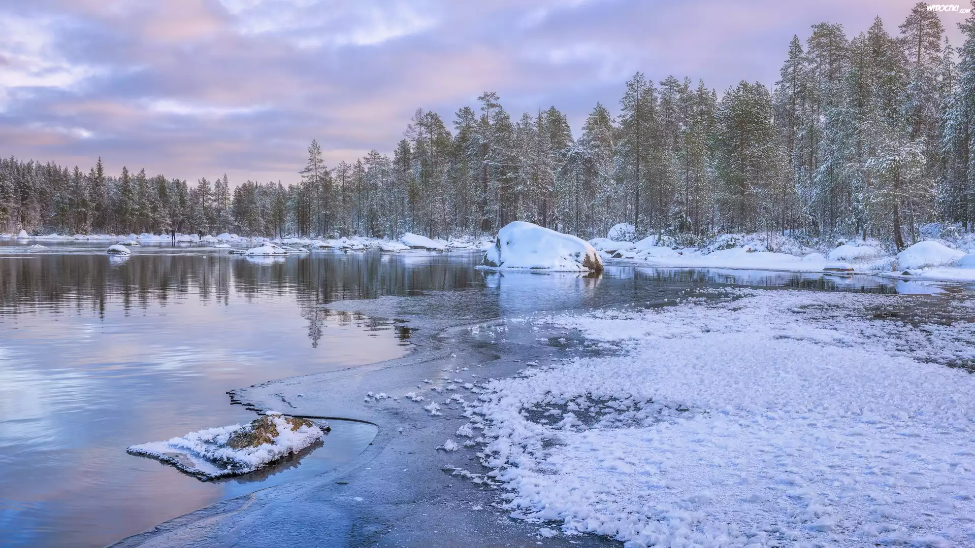 Zdj臋cia, Zima, Drzewa, Jezioro, Oblodzone