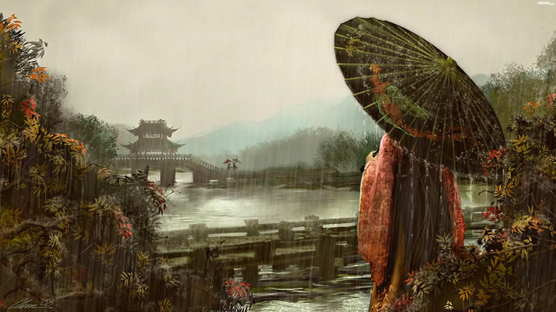 Zdjęcia, Obraz, Japoński, Domek, Deszcz, Kobieta, Parasol