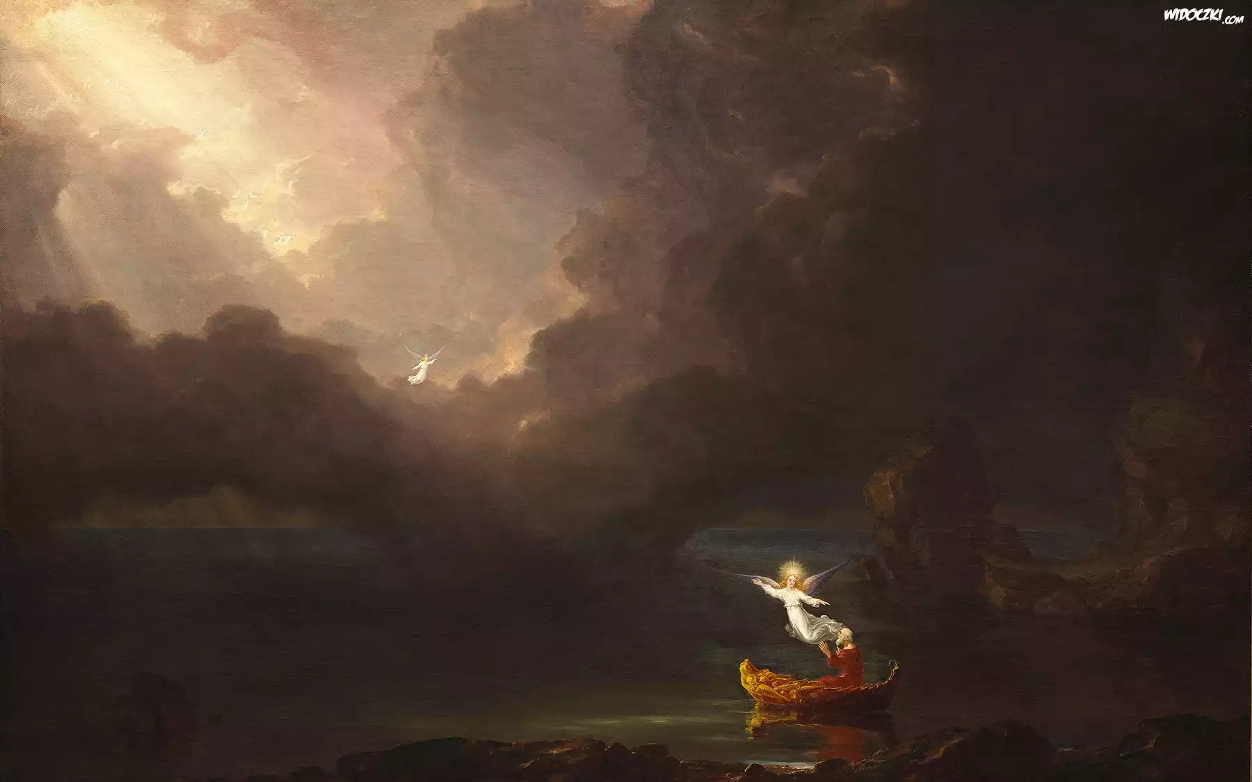 Zdjęcia, Malarstwo, Obraz, Niebo, Chmury, Łódka, Starzec, Anioły