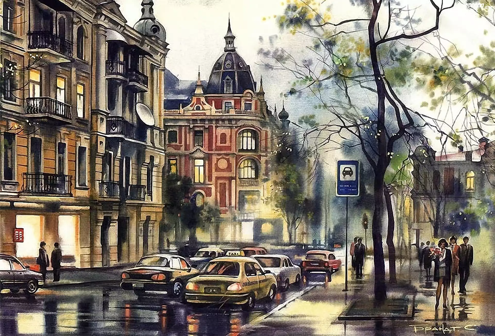 Malarstwo, Obraz, Ulica, Miasto, Stare, Kamienice, Przechodnie