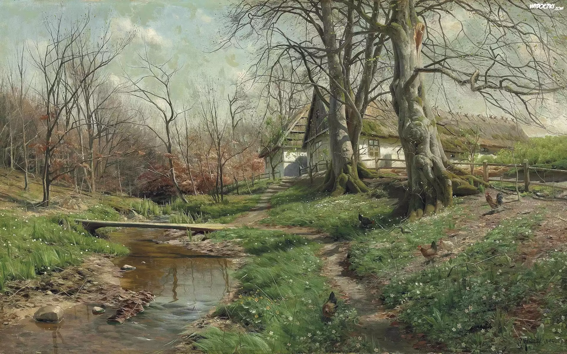 Obraz, Malarstwo, Wieś, Wiosna, Pejzaż, Kwiaty, Zawilce, Rzeka, Drewniana, Kładka, Drzewa, Domy, Kury, Peder Mork Monsted |