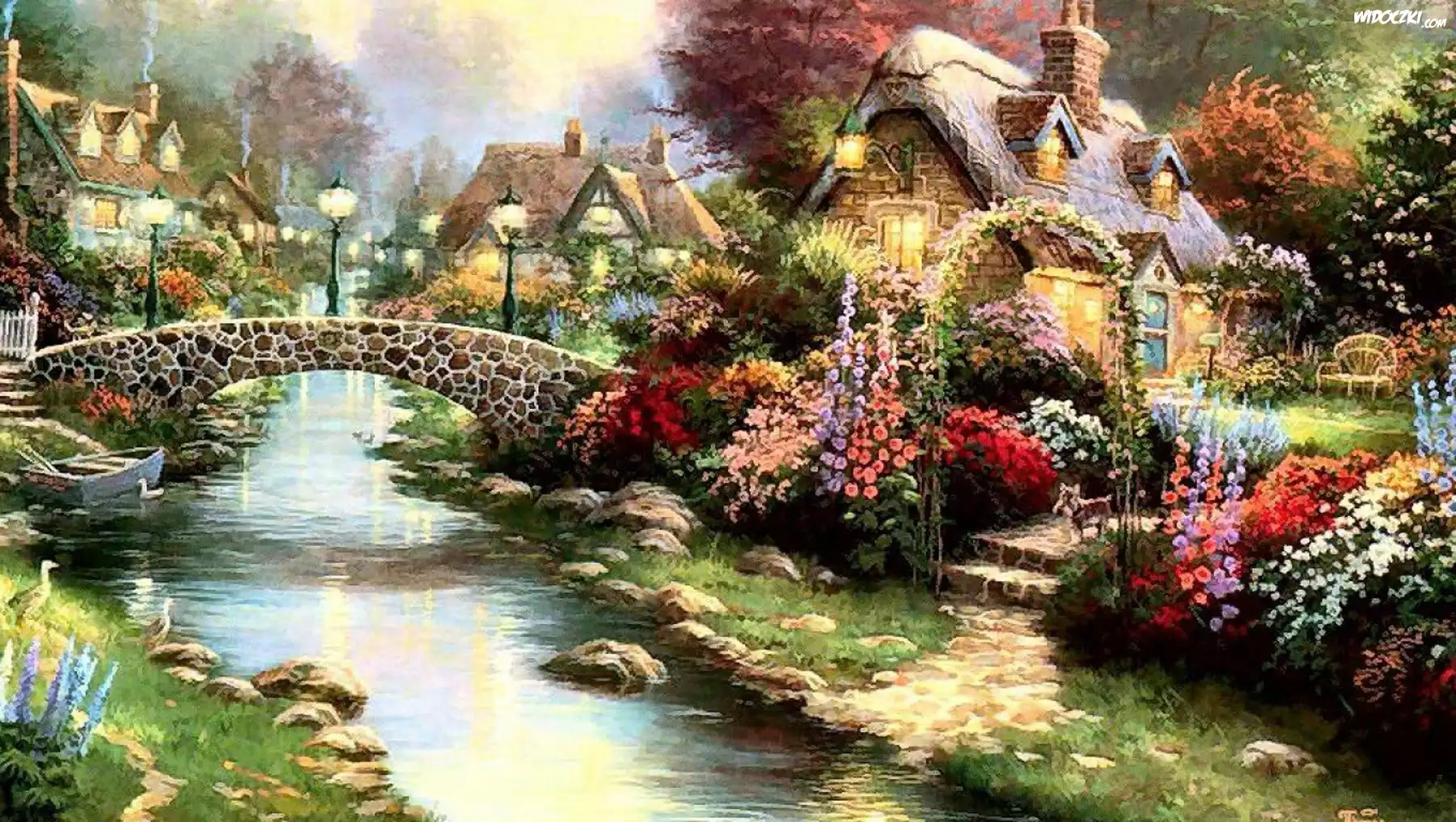 Zdjęcia, Obraz, Domek, Rzeczka, Mostek