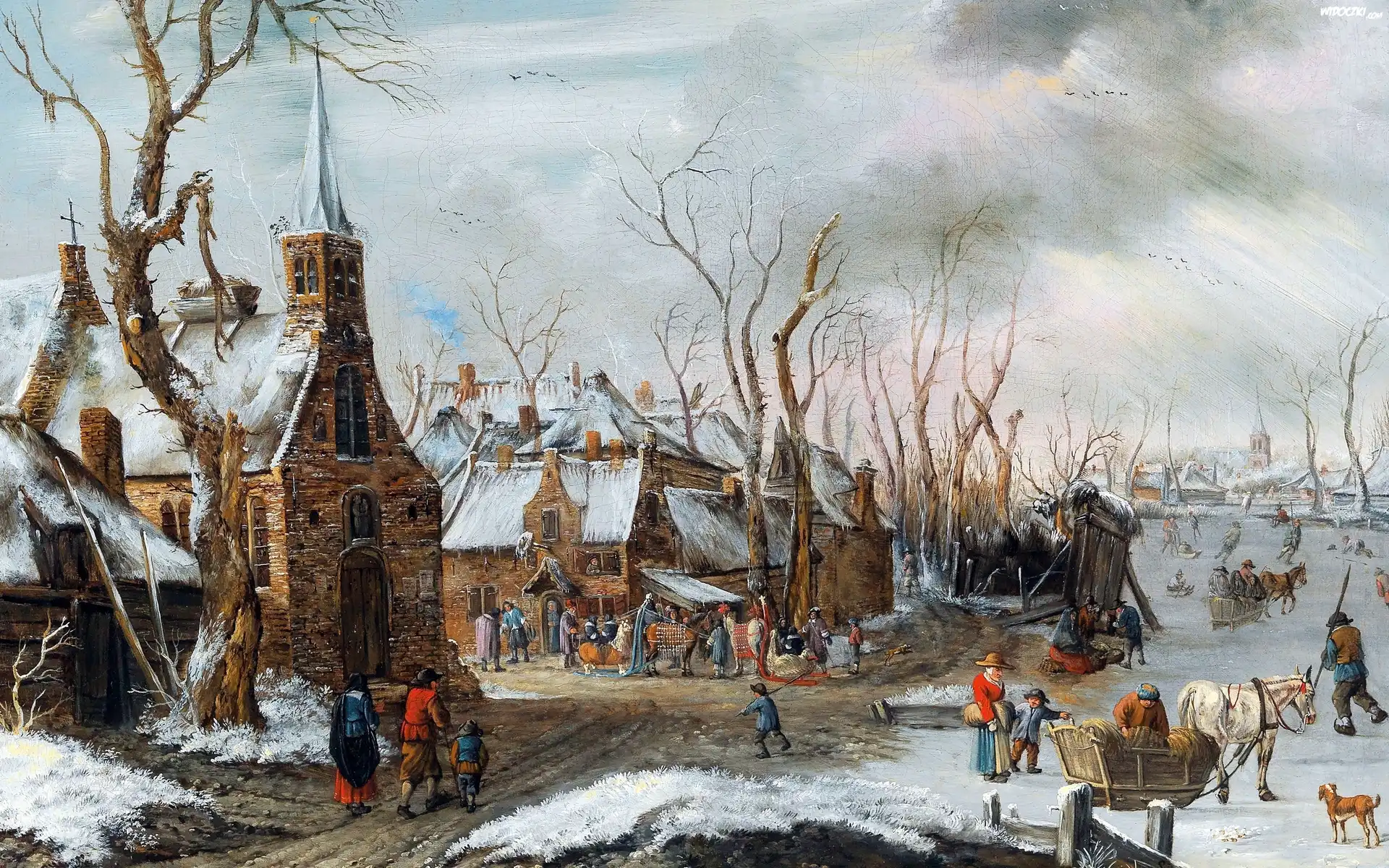 Zdjęcia, Malarstwo, Obraz, Salomon Rombouts, Targ, Ludzie, Kościół, Zima
