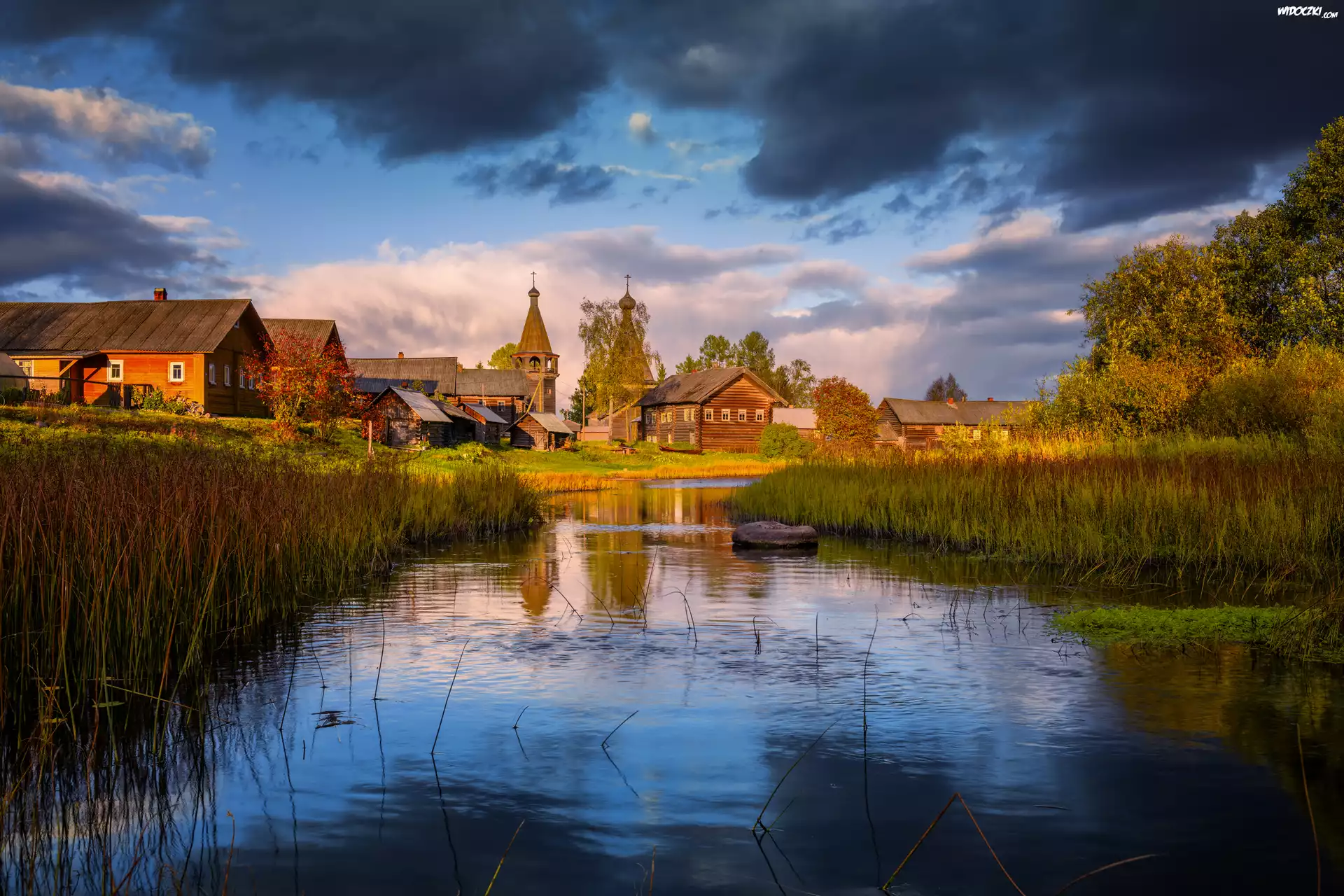 Zdjęcia, Wschód słońca, Jezioro, Trzciny, Drzewa, Wieś, Cerkiew, Domy, Chmury, Obwód archangielski, Rosja