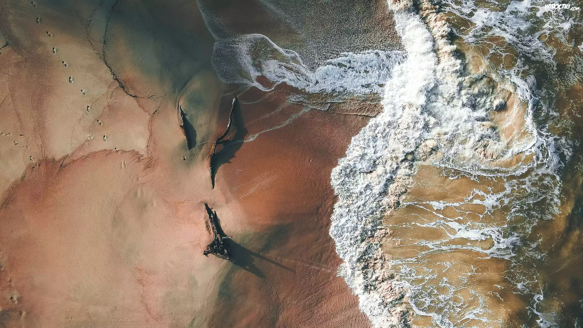 Zdjęcia, Morze, Ocean, Plaża, Fala, Kłody, Z lotu ptaka