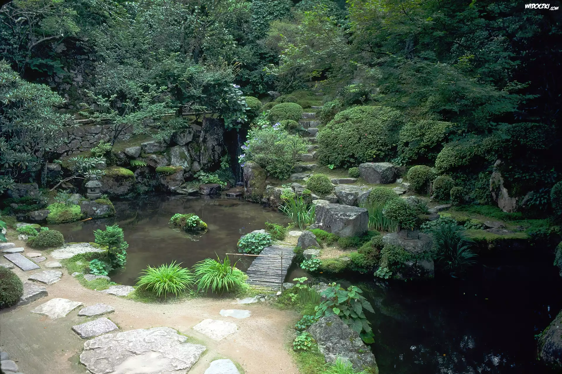 Zdjęcia, Oczko, Wodne, Krzewy, Mostek, Park