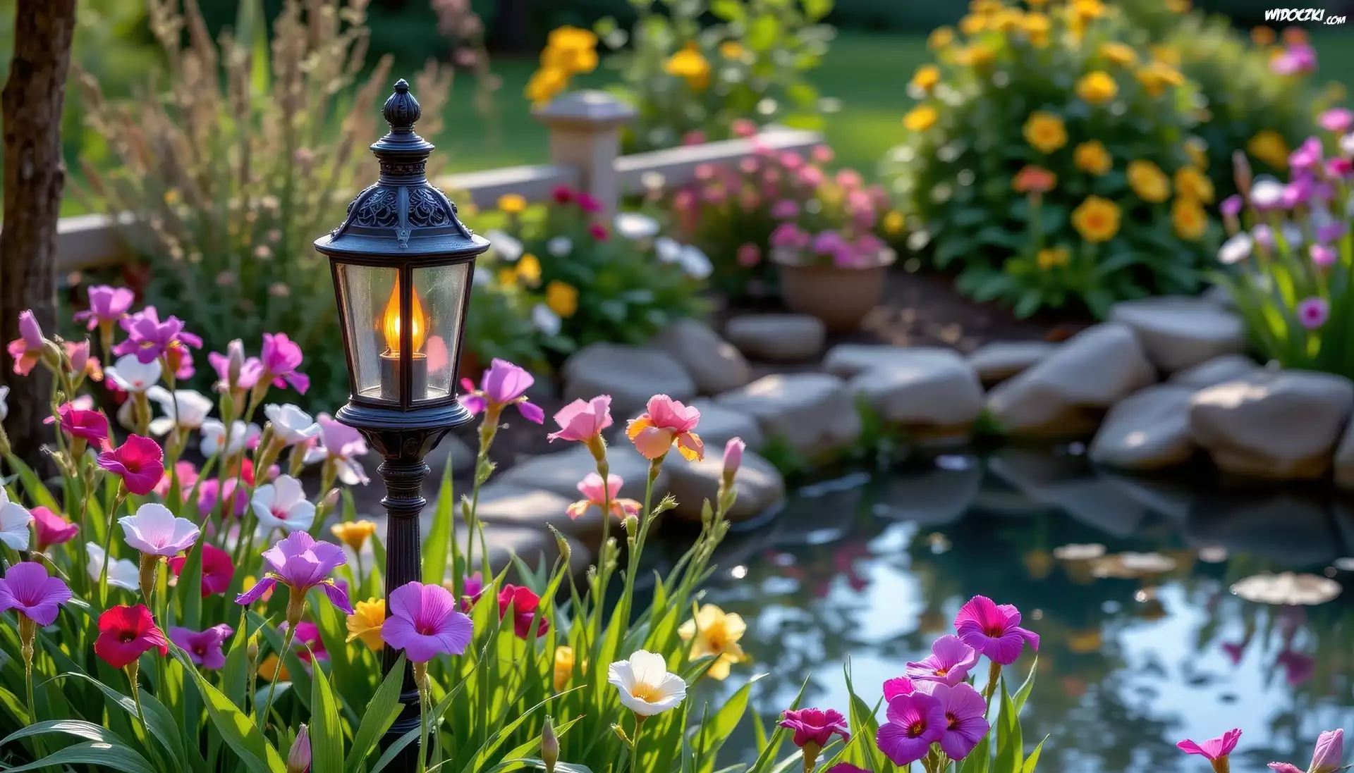 Zdjęcia, Latarnia, Kwiaty, Ogród, Oczko wodne, Grafika AI